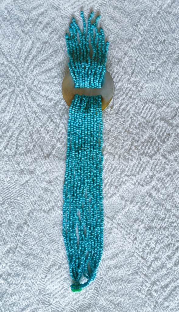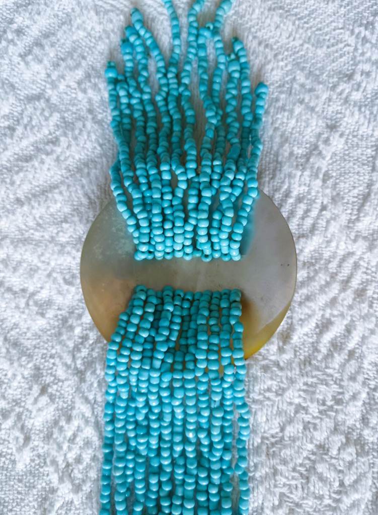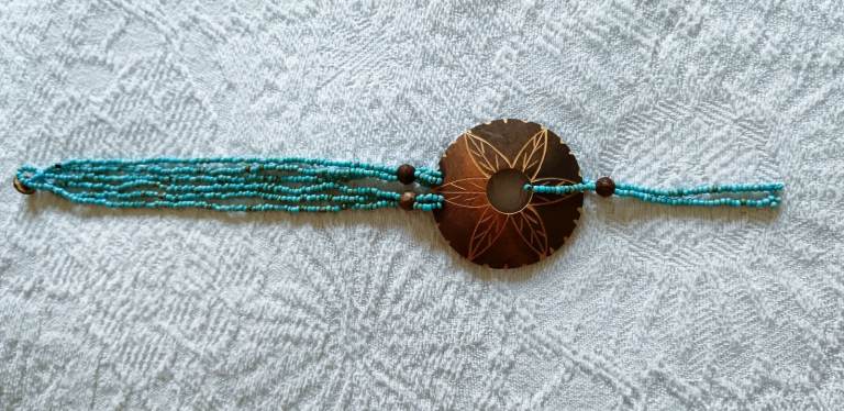 3 Piece necklace set. Turquoise Beads, engraved wood and shell design. A shell choker, plus 2 longer turquoise beaded necklaces. £3 each A great trio gift set!