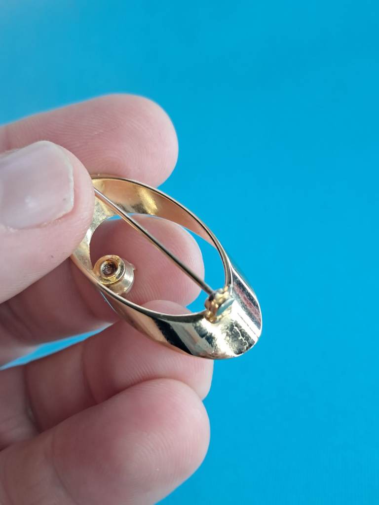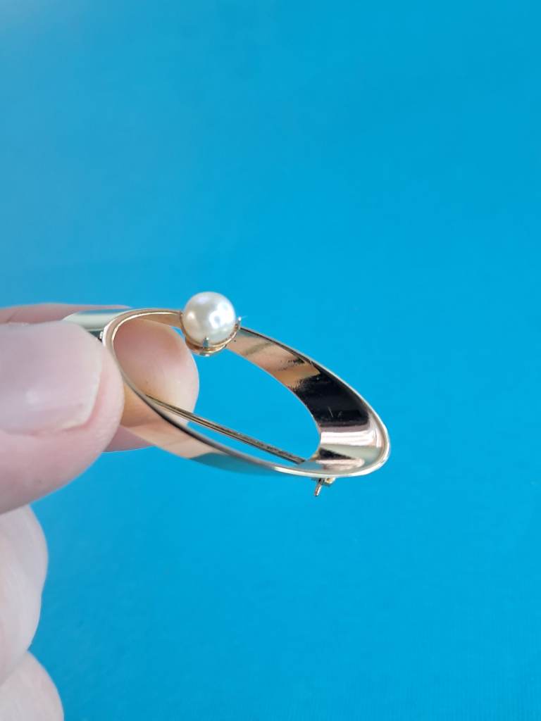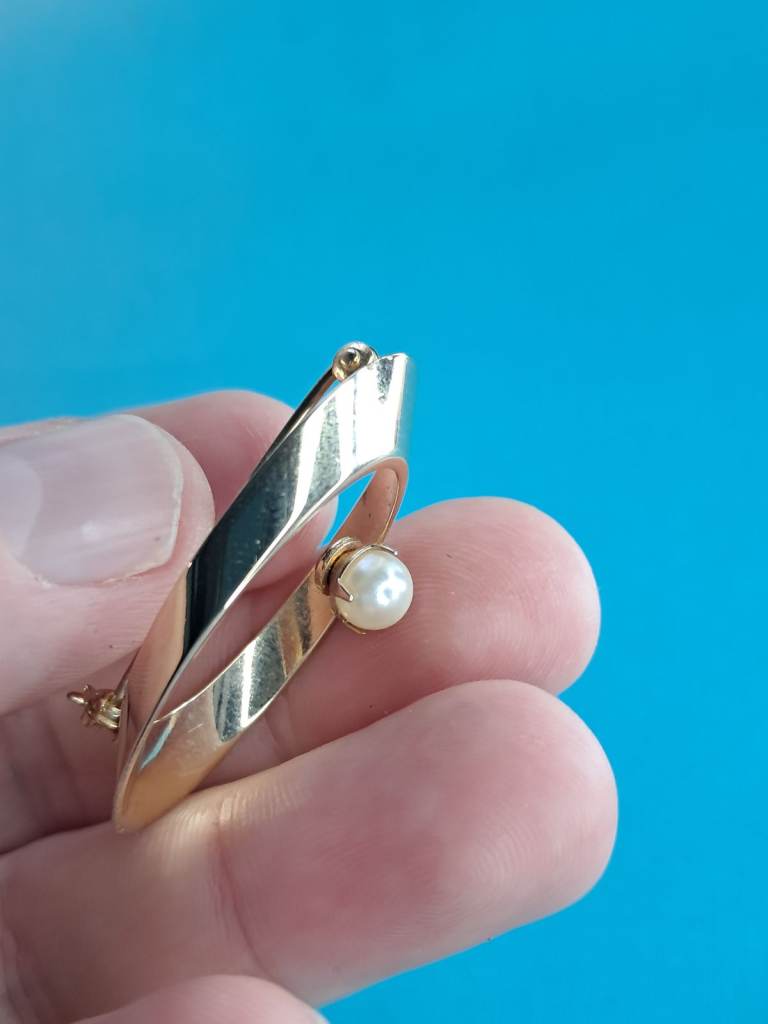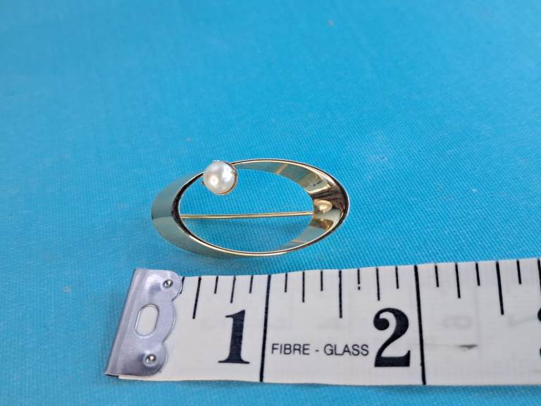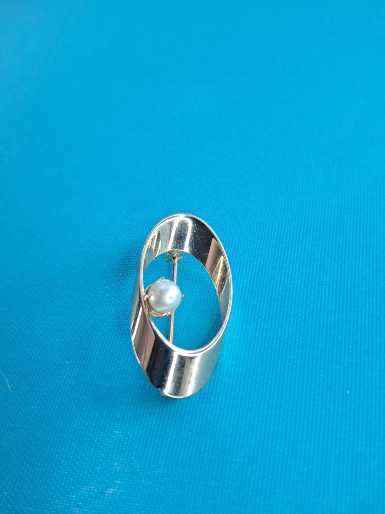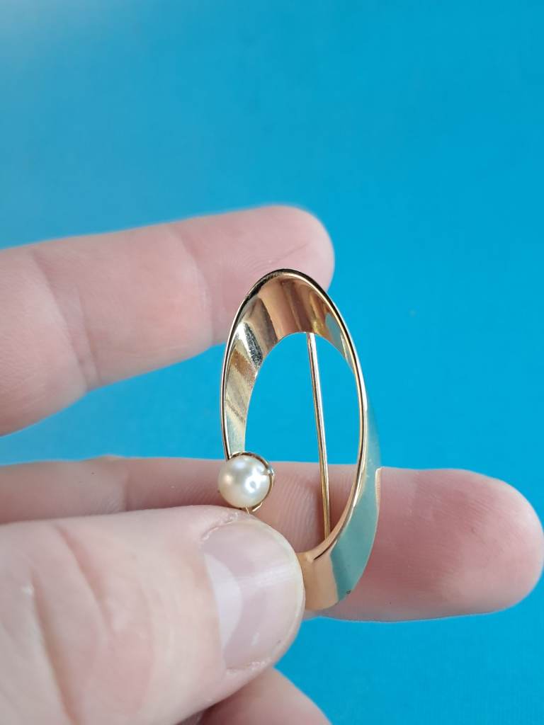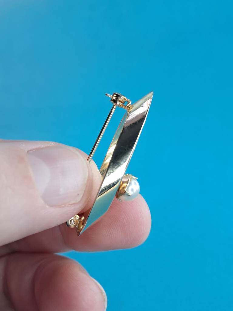 Vintage 1950s gold tone with pearl brooch. classic retro mid-century ribbon shaped.