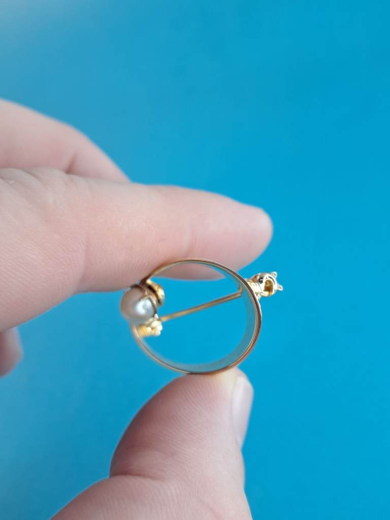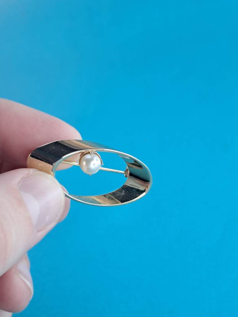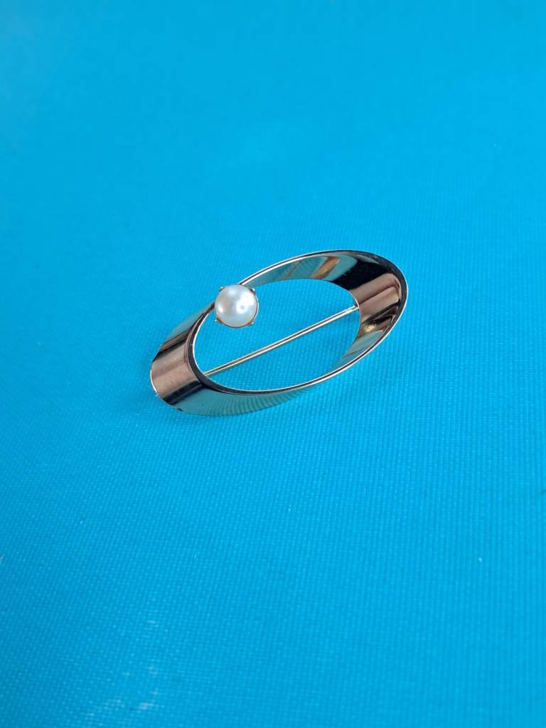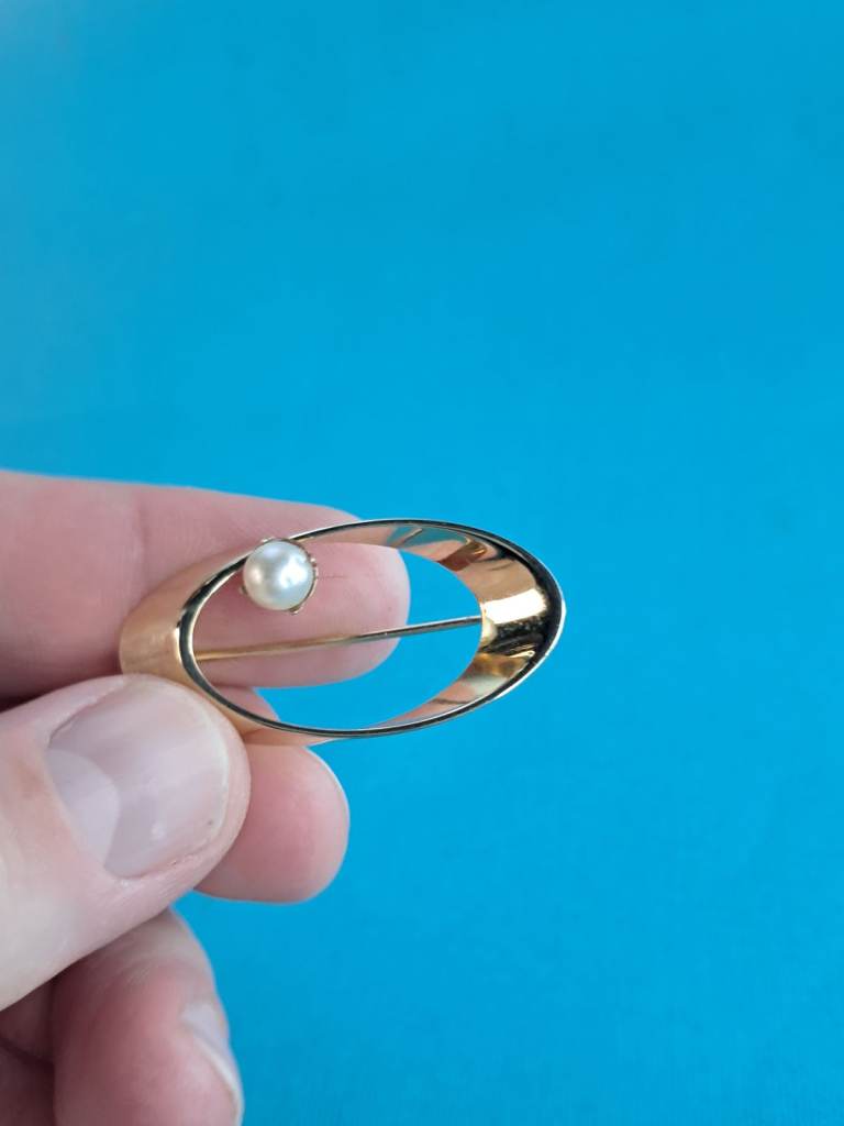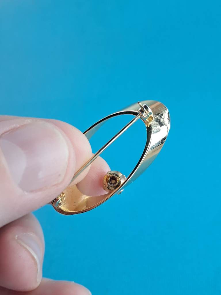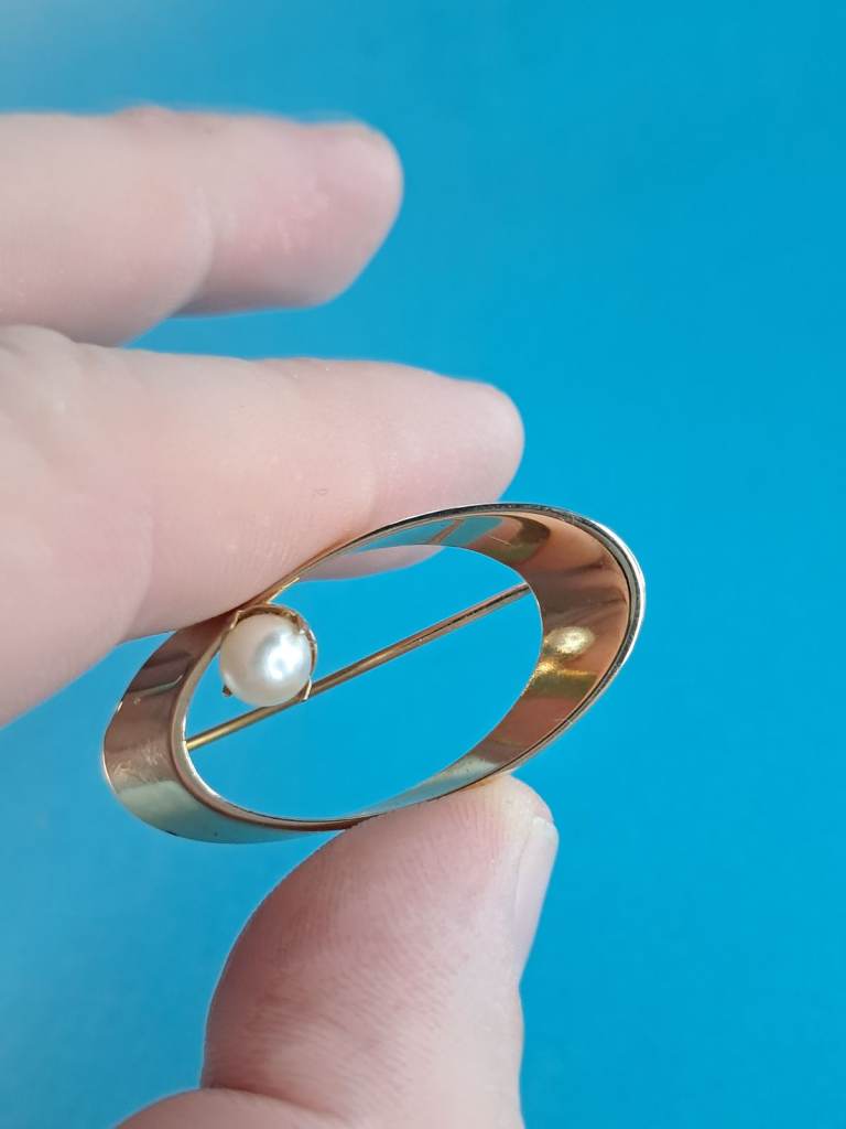 Vintage 1950s gold tone with pearl brooch. classic retro mid-century ribbon shaped.