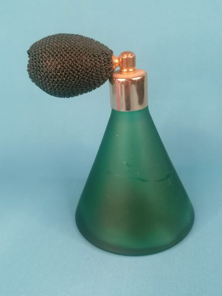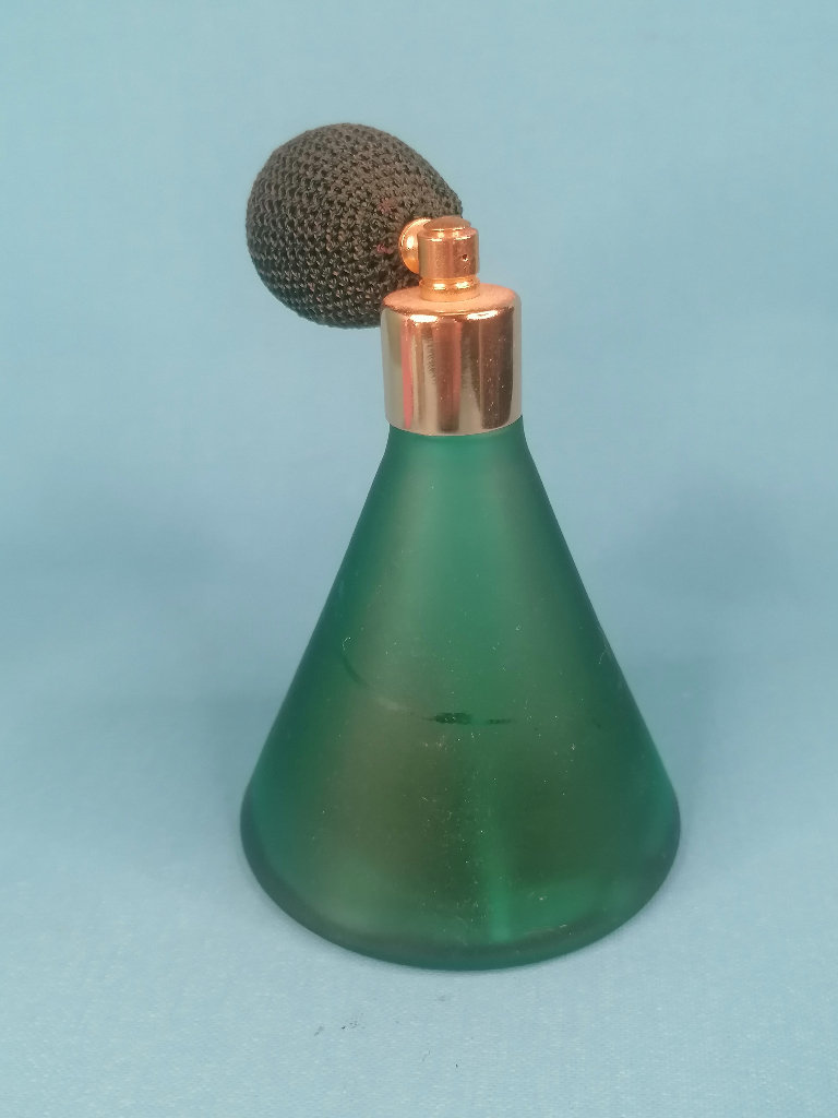 Vintage 4,2-inch Tall Beautiful Vintage Art Deco Frosted Green Perfume Atomizer Bottle.