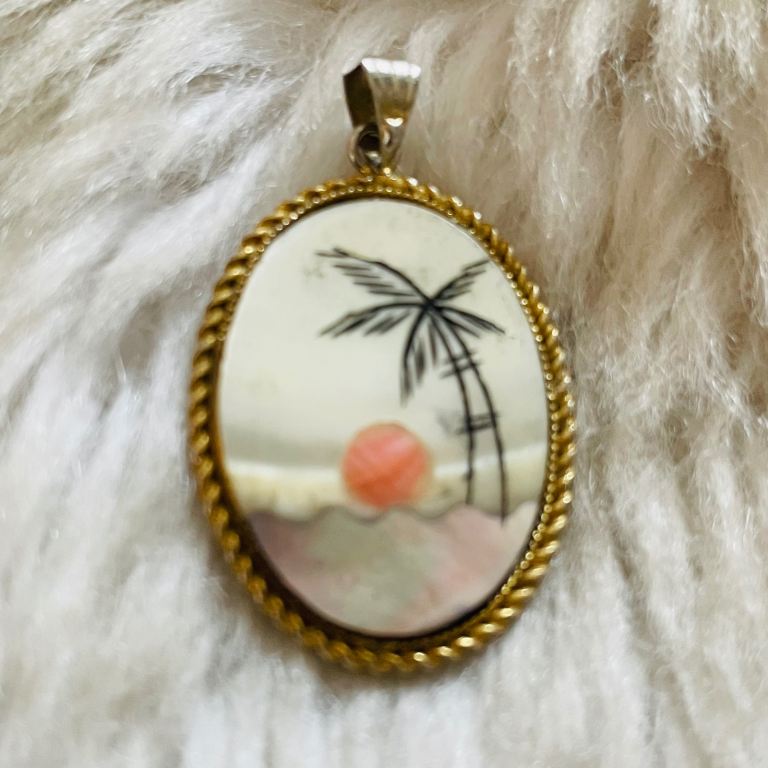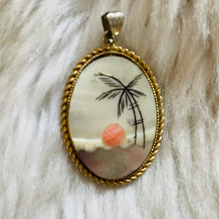 Vintage Abalone Shell Mother Of Pearl Painted Palm Tree Sunset Beach Paradise Island Oval Pendant