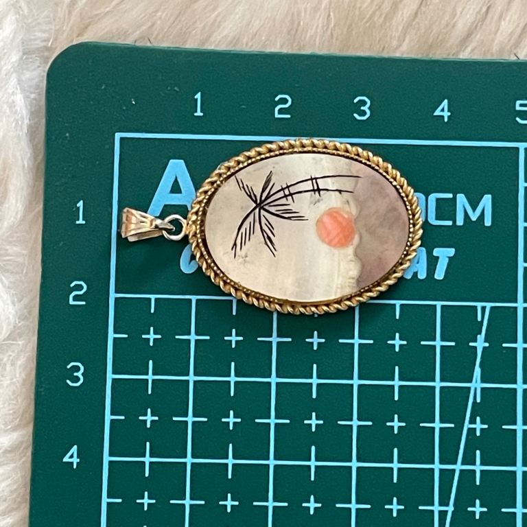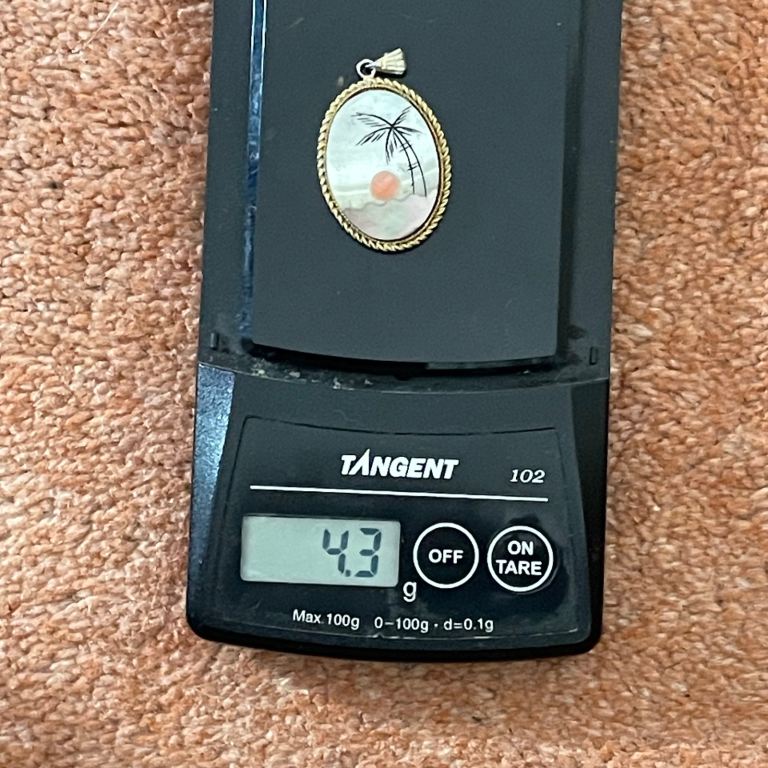 Vintage Abalone Shell Mother Of Pearl Painted Palm Tree Sunset Beach Paradise Island Oval Pendant Silver Tone Bale & Back And Gold Tone Rope Twist Edge