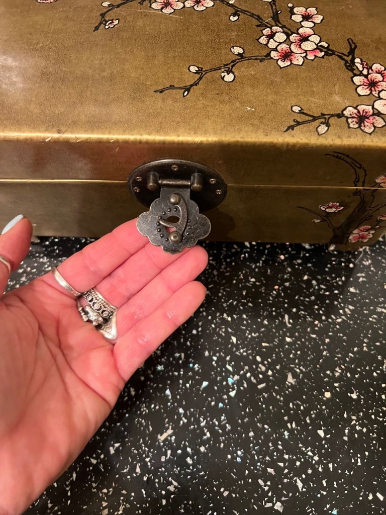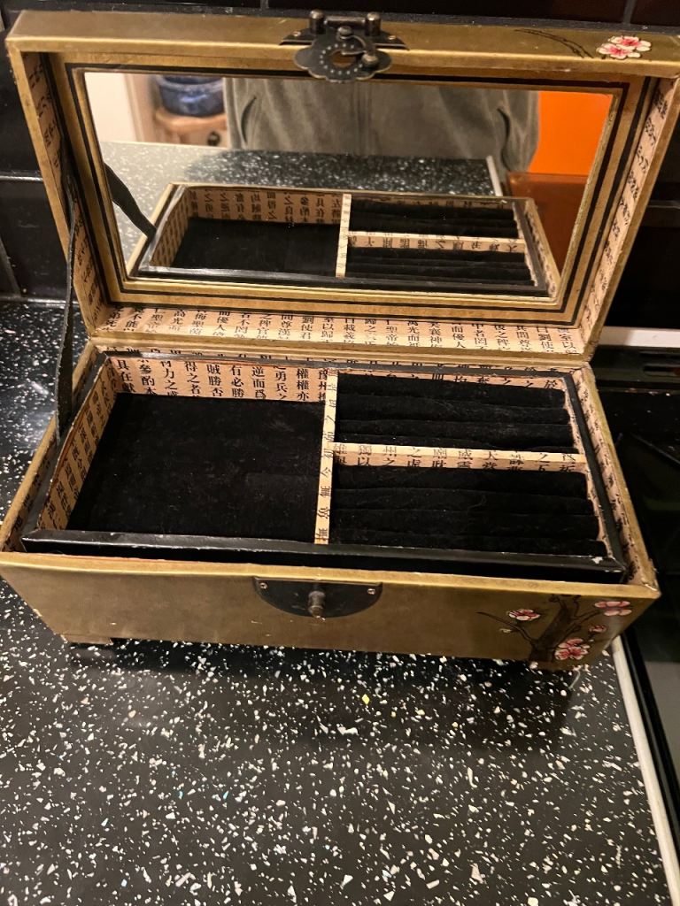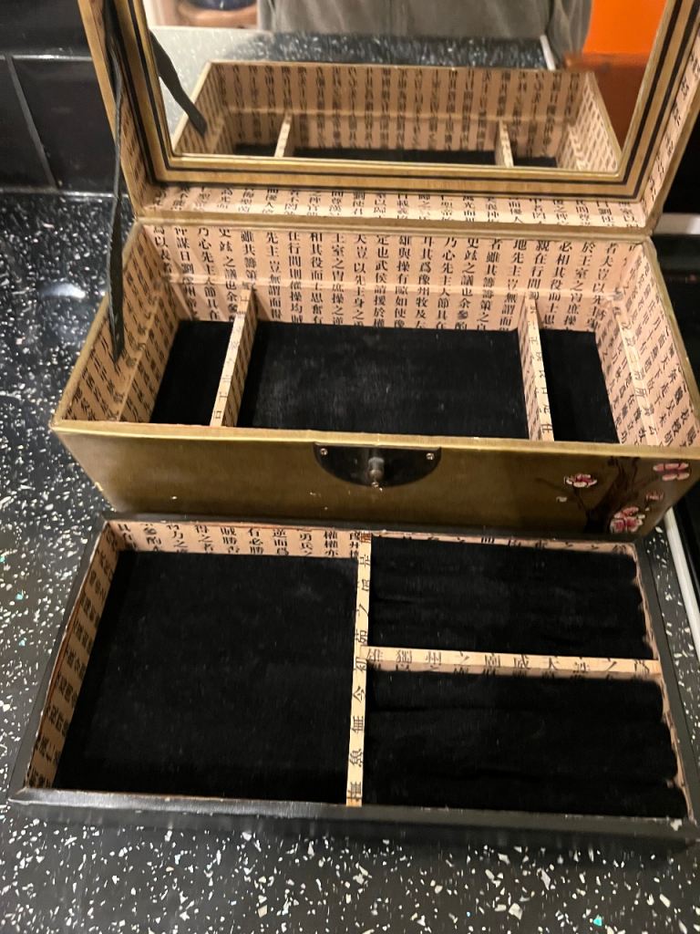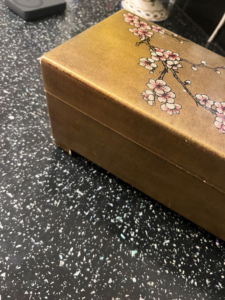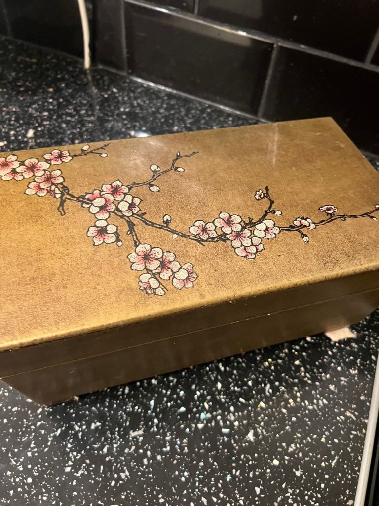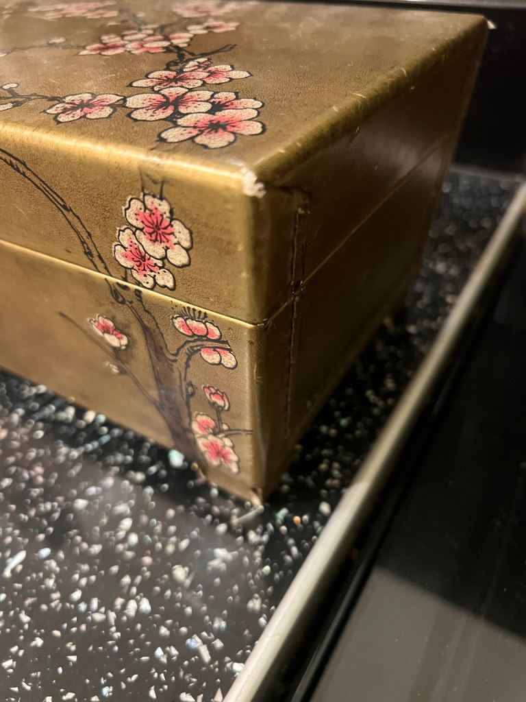 Japanese-style design with cherry blossom branches.Printed paper exterior with a gilt-gold background Interior lined with faux calligraphy paper and black velvet/felt