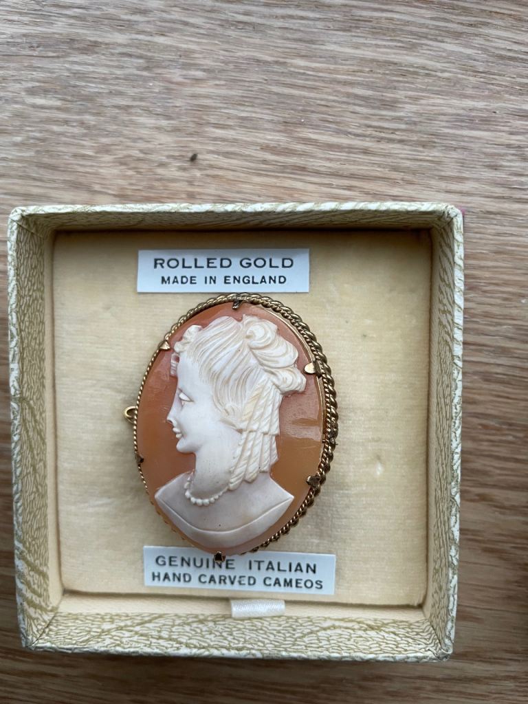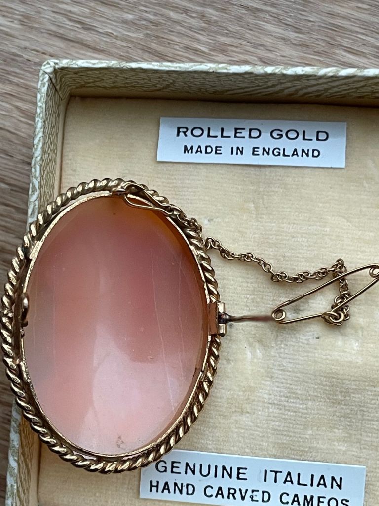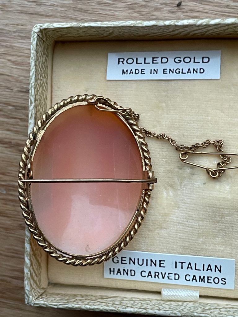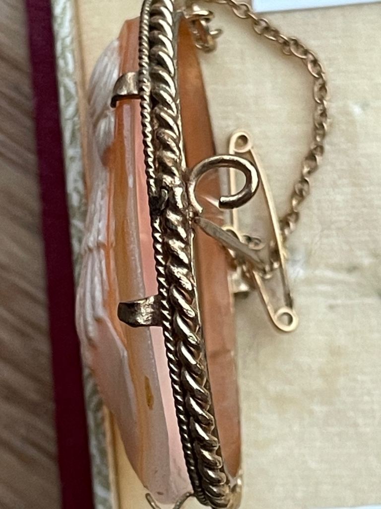 Genuine Italian hand carved cameo brooch set in a rolled gold mount. In original Box. 33 mil Wx43 mil L. Ornate pretty design with gold outer mount and pin clasp and chain. Six small clasps holding the cameo in place.