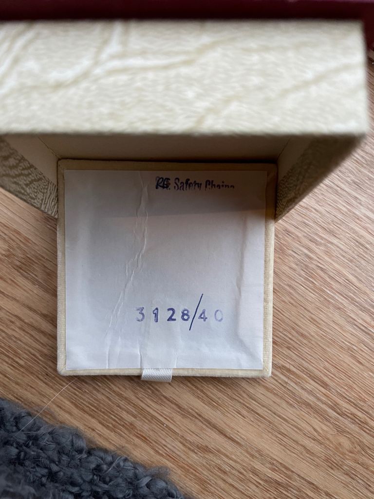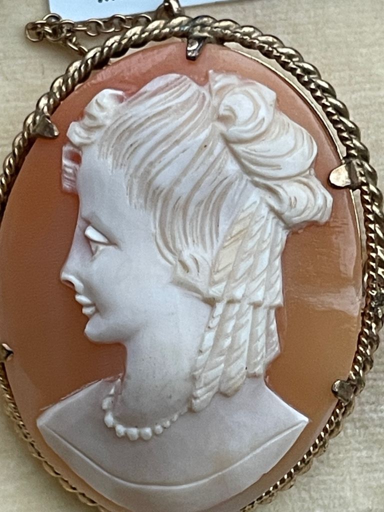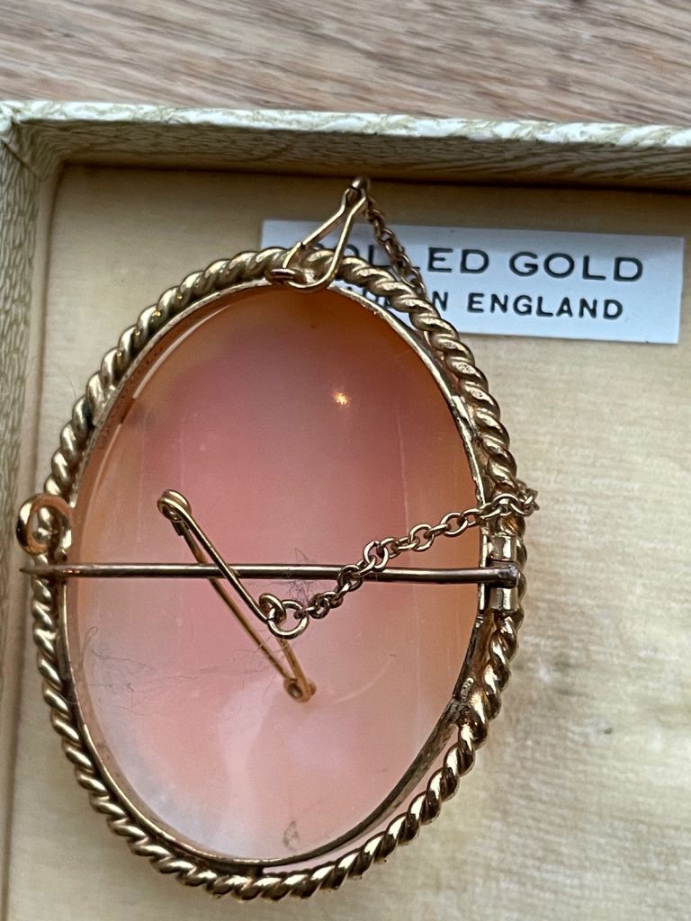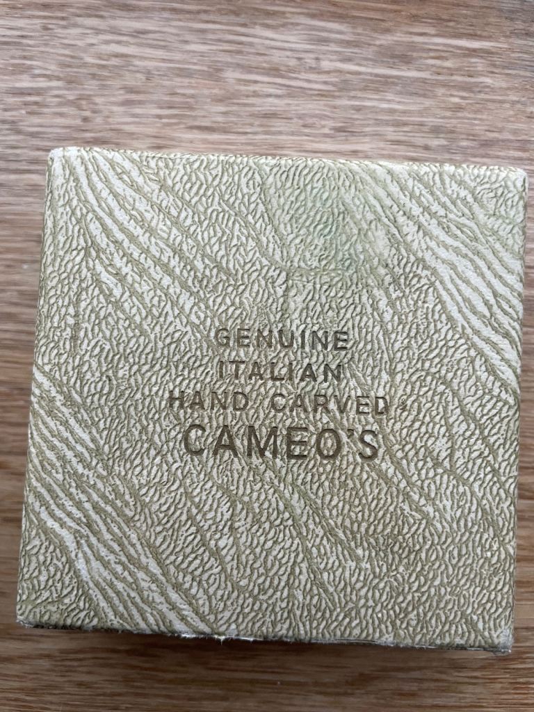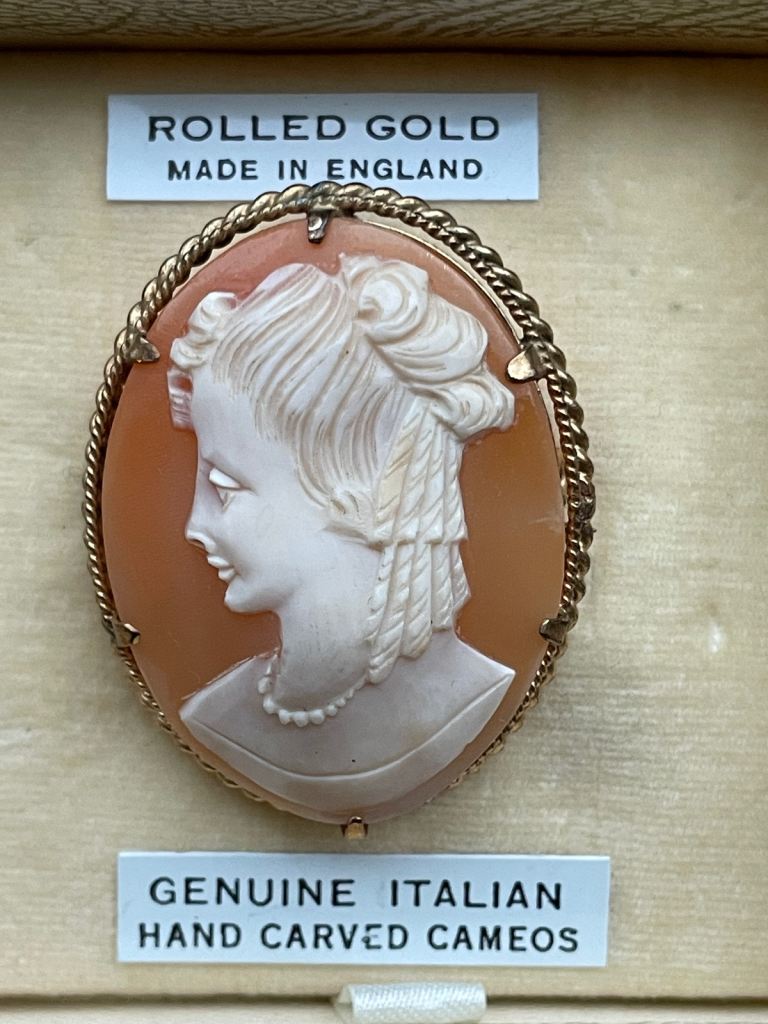 Genuine Italian hand carved cameo brooch set in a rolled gold mount. In original Box. 33 mil Wx43 mil L. Ornate pretty design with gold outer mount and pin clasp and chain. Six small clasps holding the cameo in place.