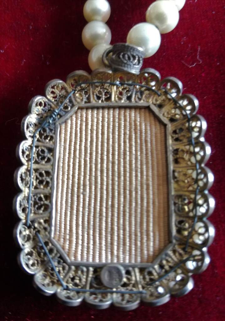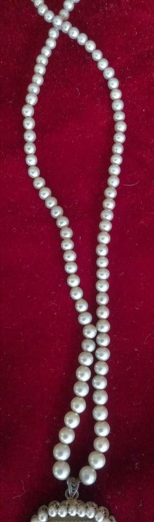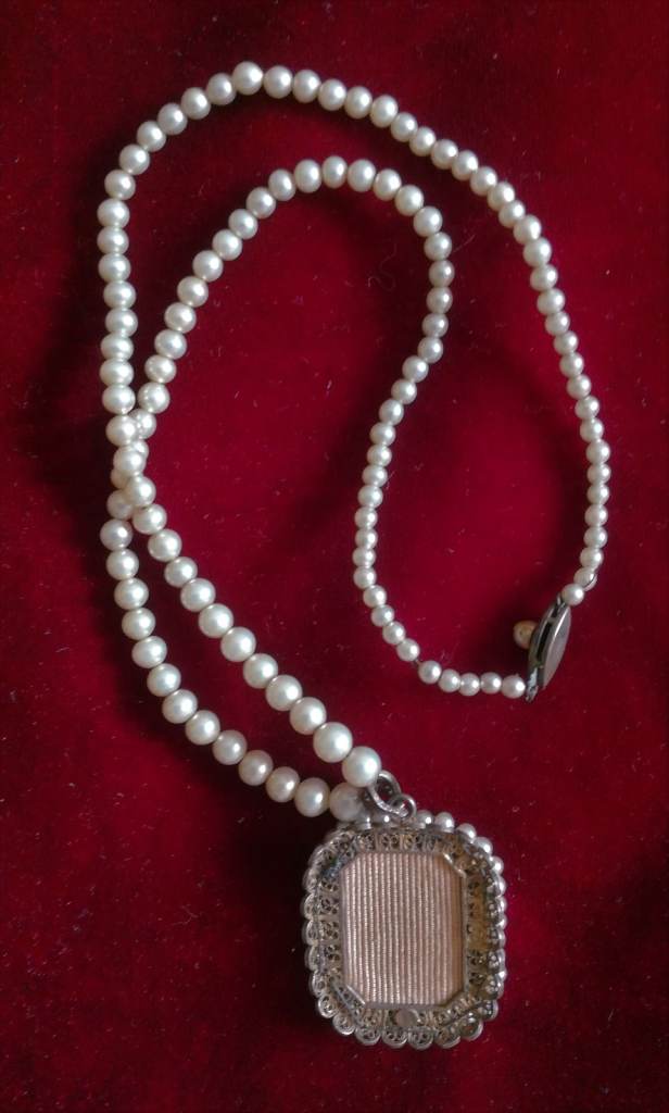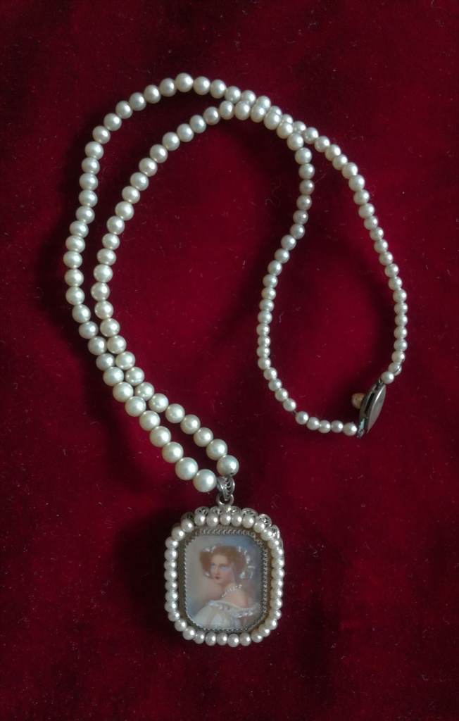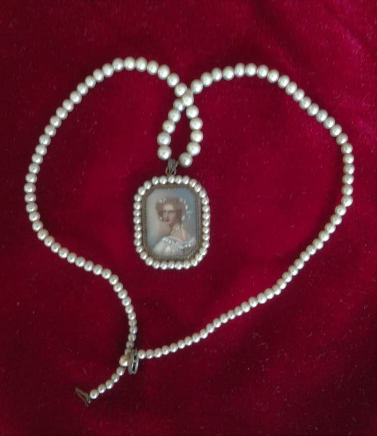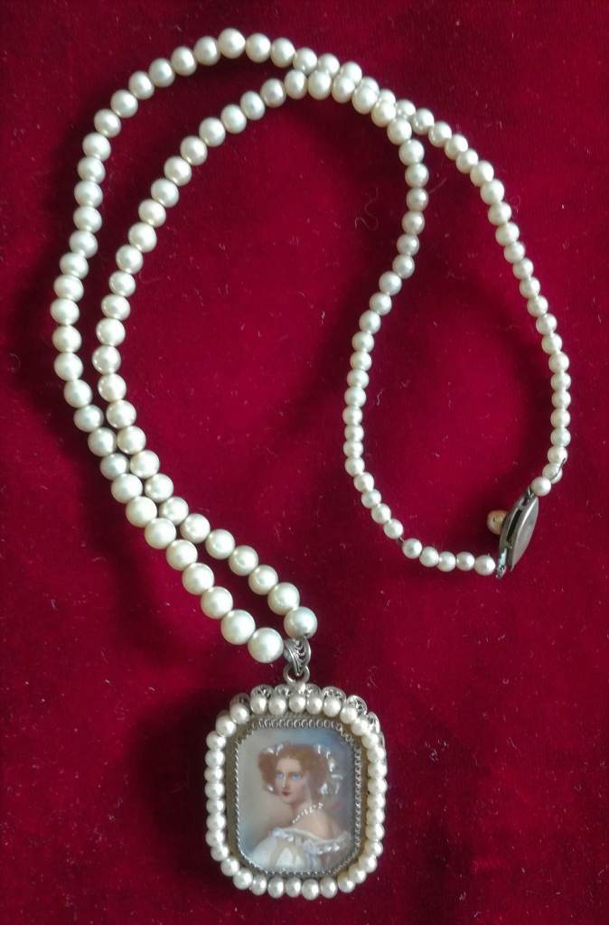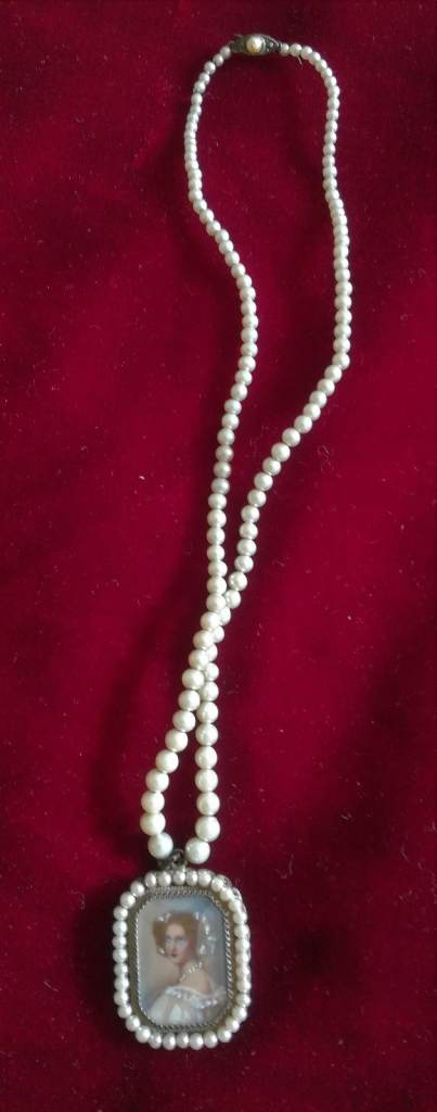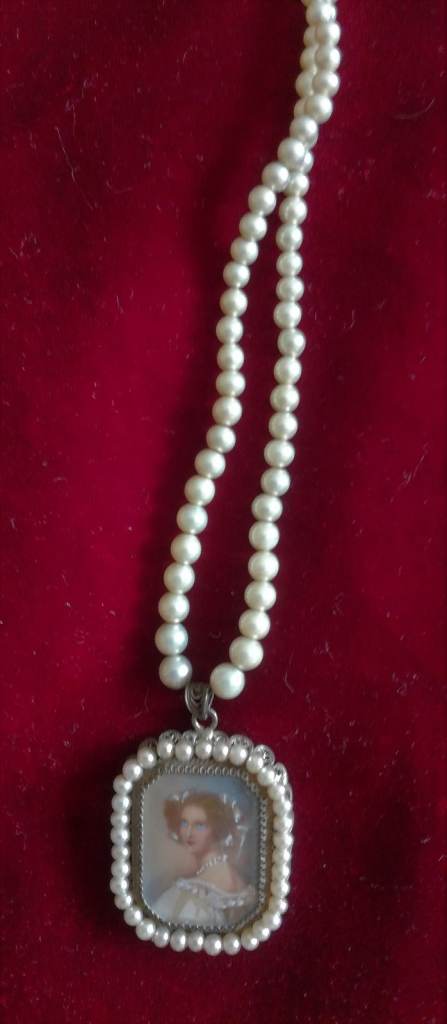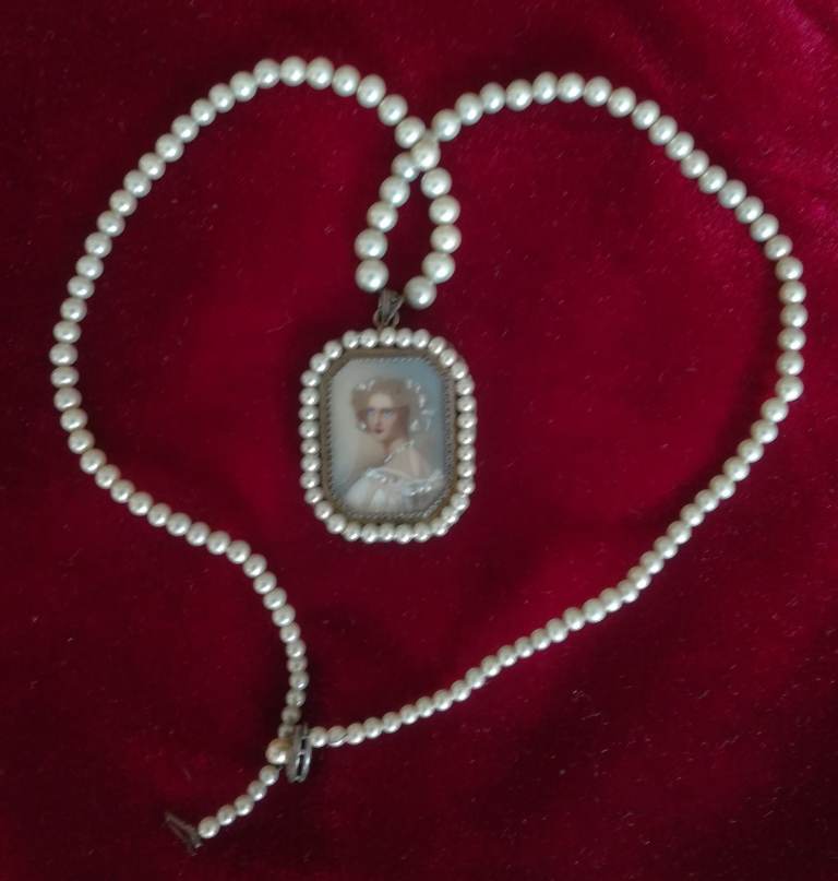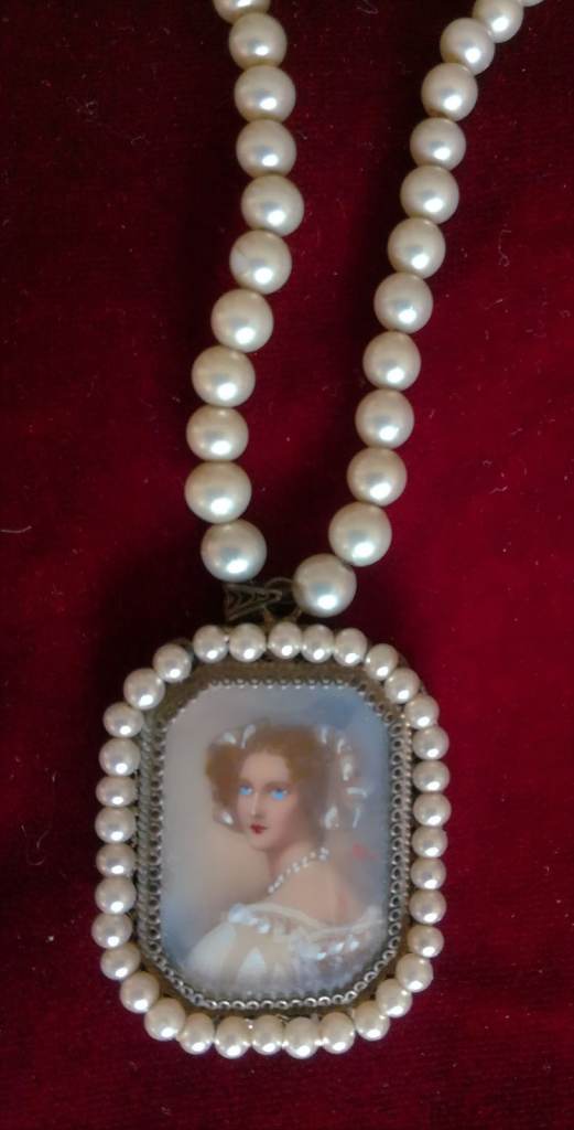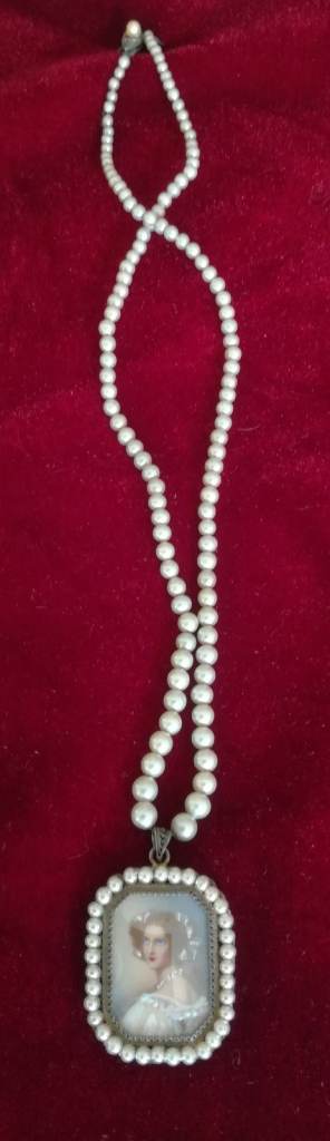 VINTAGE Pendant Ladies Painted Portrait Pearl String Necklace Silver Metal Period Costume Theatre