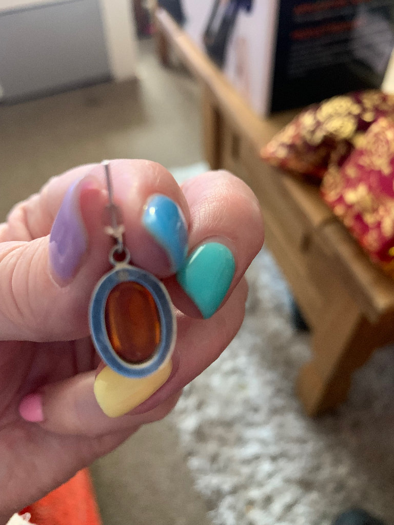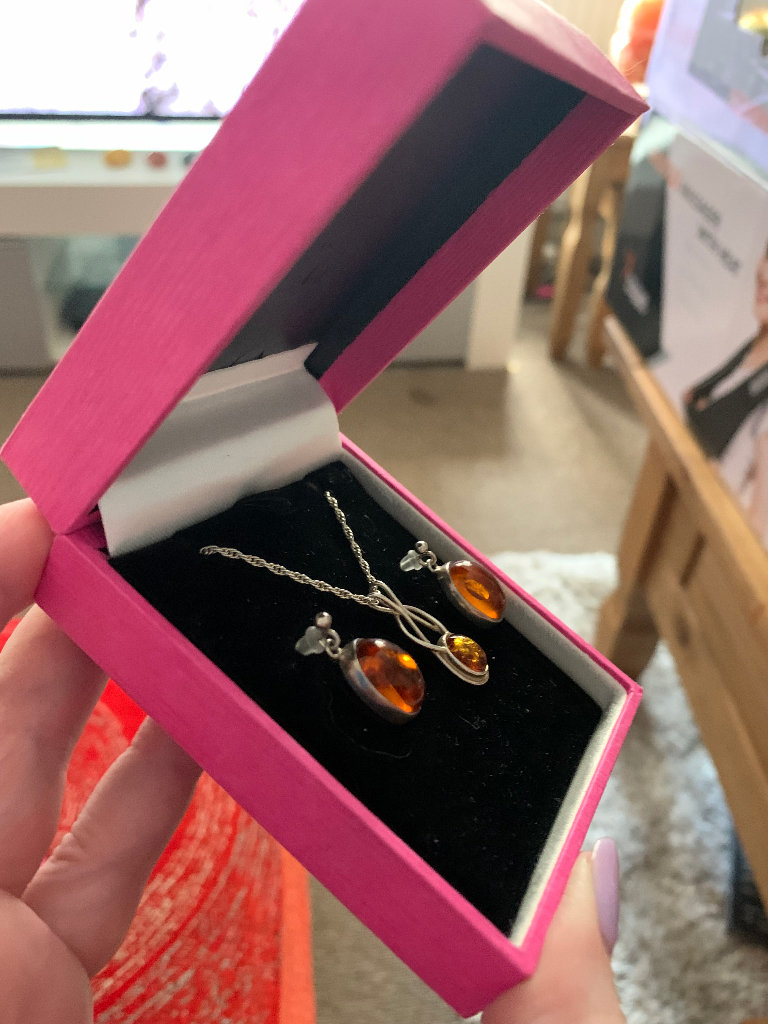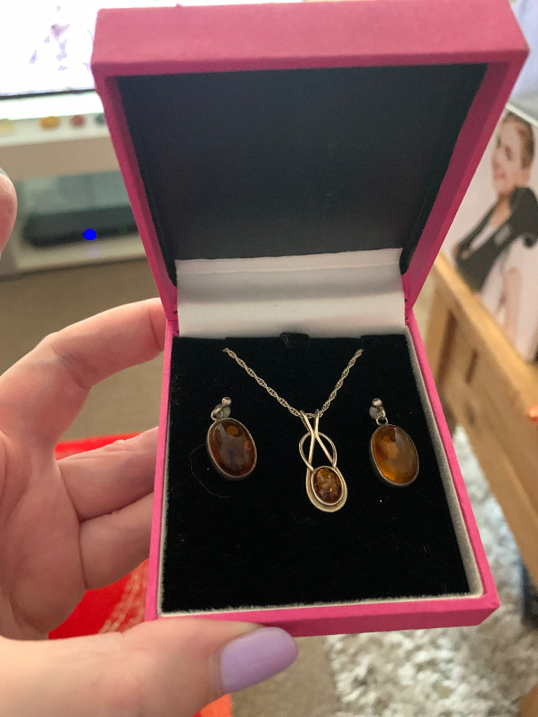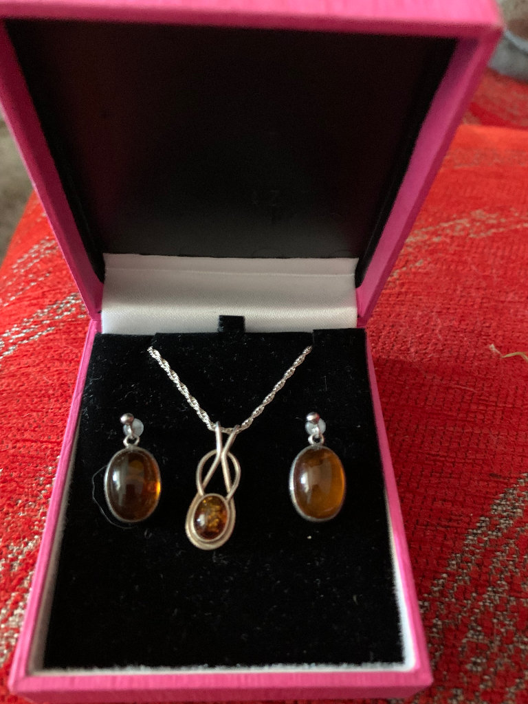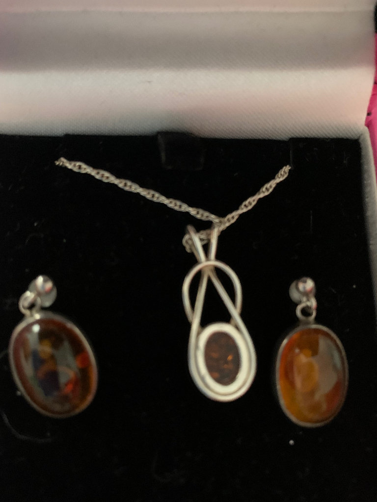 Hallmarked vintage silver jewellery. Amber pendant is on a rope chain. Original backs missing from the earrings so they have been replaced with plastic ones. Comes in a pink cardboard box.