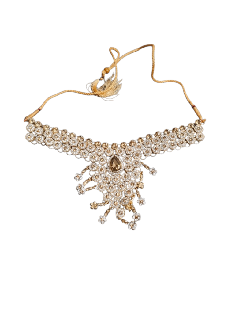 Exquisite Asian bridal jewellery set in very good condition, perfect for weddings and special occasions. This elegant set features intricate white diamond-style stones set in a champagne gold-tone metal finish.