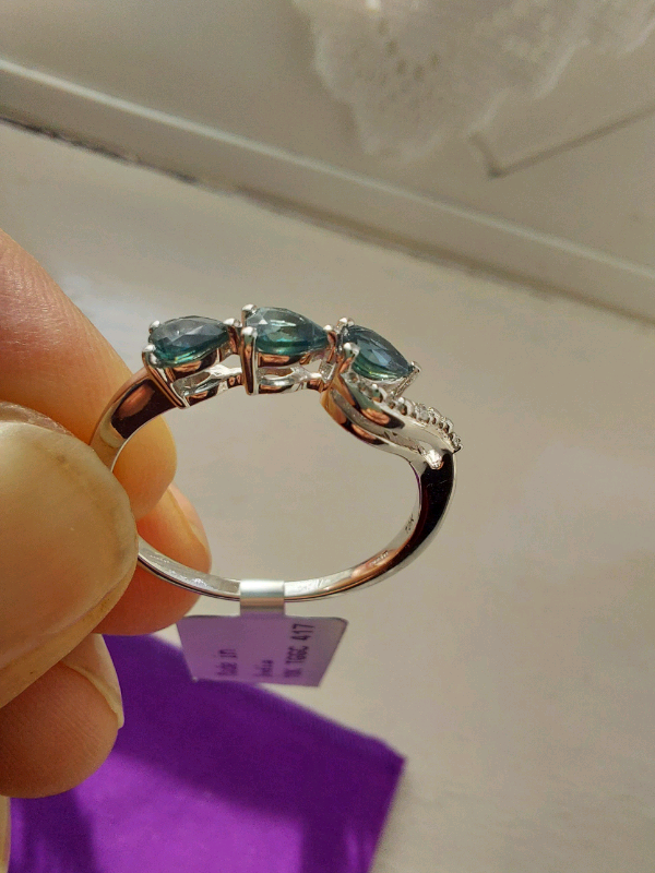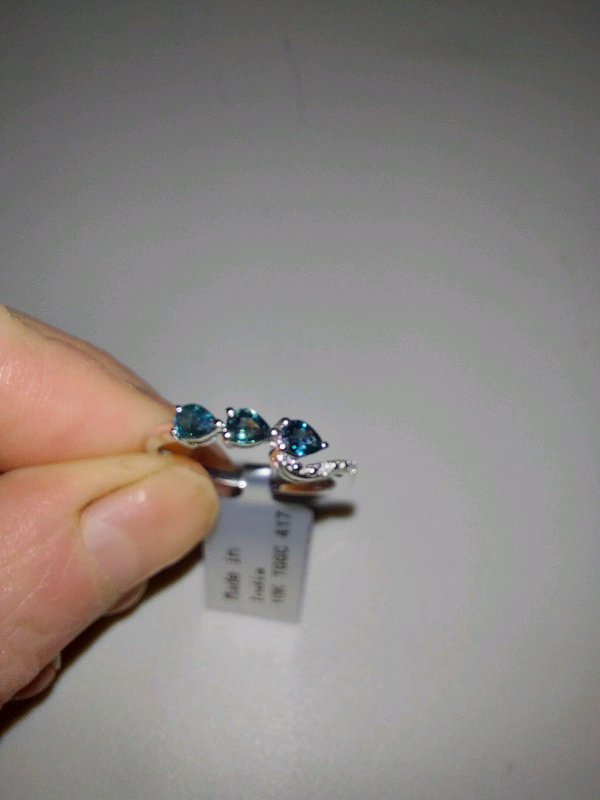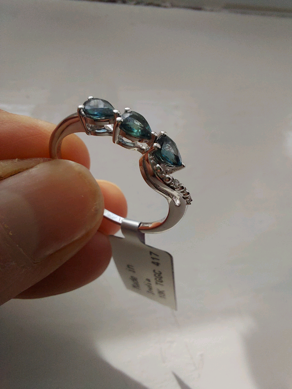 Brand new with tag 10K white gold ring with three pear shape sapphires and two diamonds.