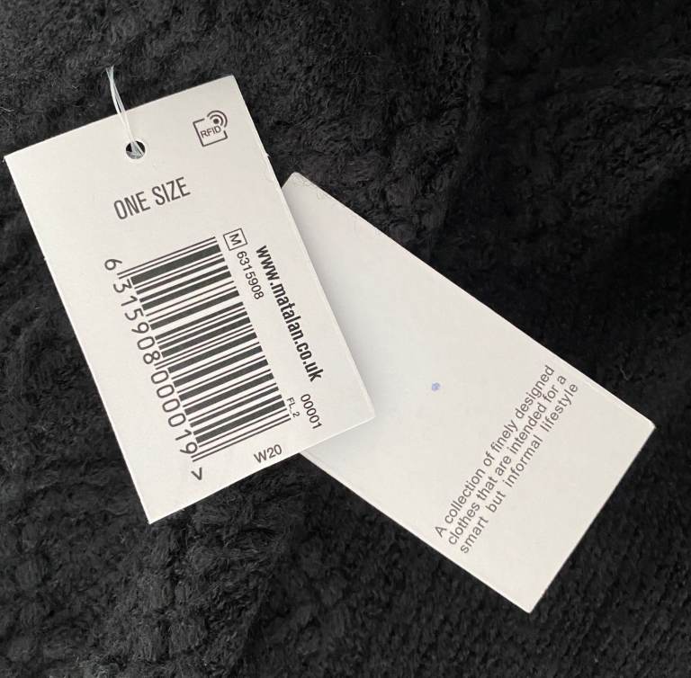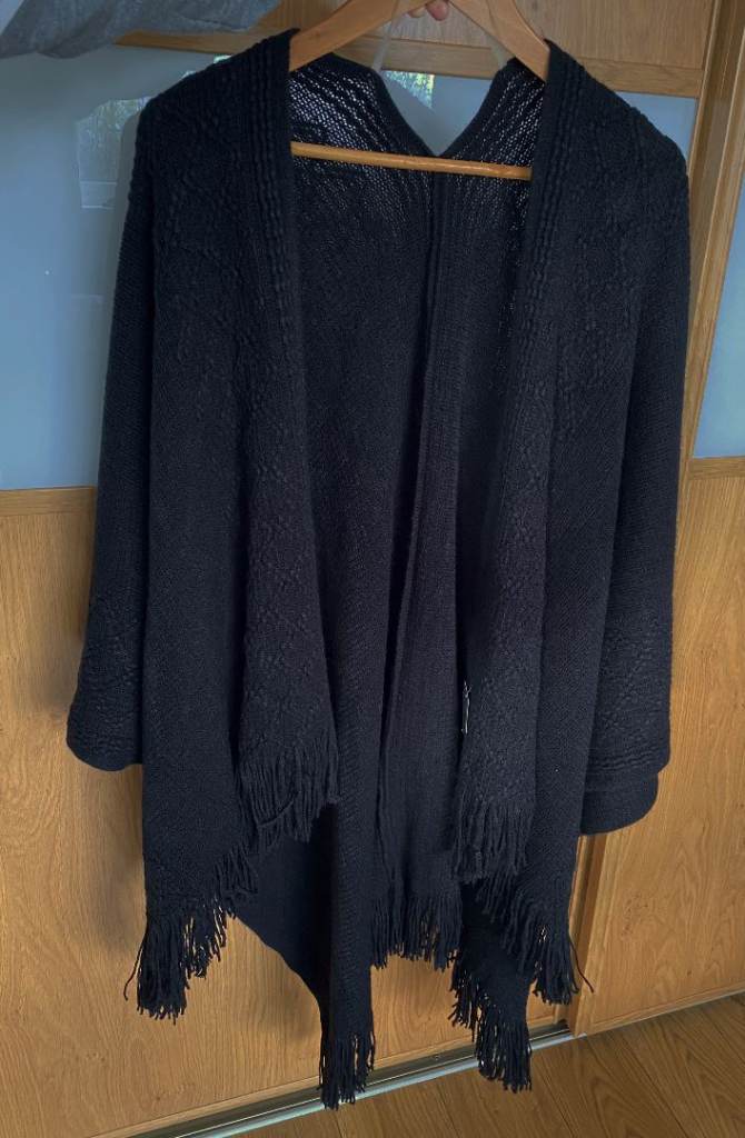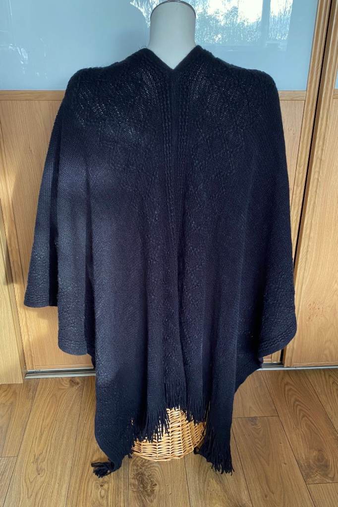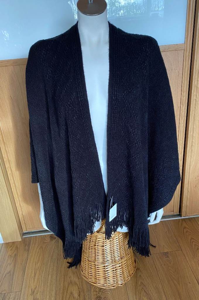 NEW BLACK KNITTED FRINGED CAPE / SHAWL, ONE SIZE, MATALAN, TAG STILL ATTACHED
