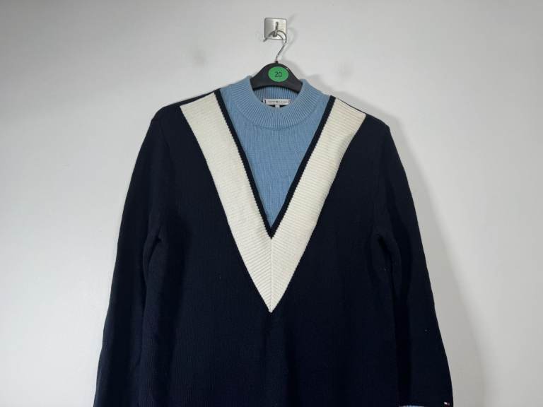 The Tommy Hilfiger Raissa Mock Neck Sweater Dress in navy blue is a stylish and versatile piece perfect for both party and casual occasions. Made from a wool mix fabric with a colourblock pattern, this long-sleeved dress features a pullover closure and ribbed trim accents. The midi length and sheath style make it a flattering choice for autumn, winter, and spring, with the Tommy Hilfiger logo adding a touch of classic elegance. Easy to care for with machine washable instructions, this dress is a must-have for any woman's wardrobe.