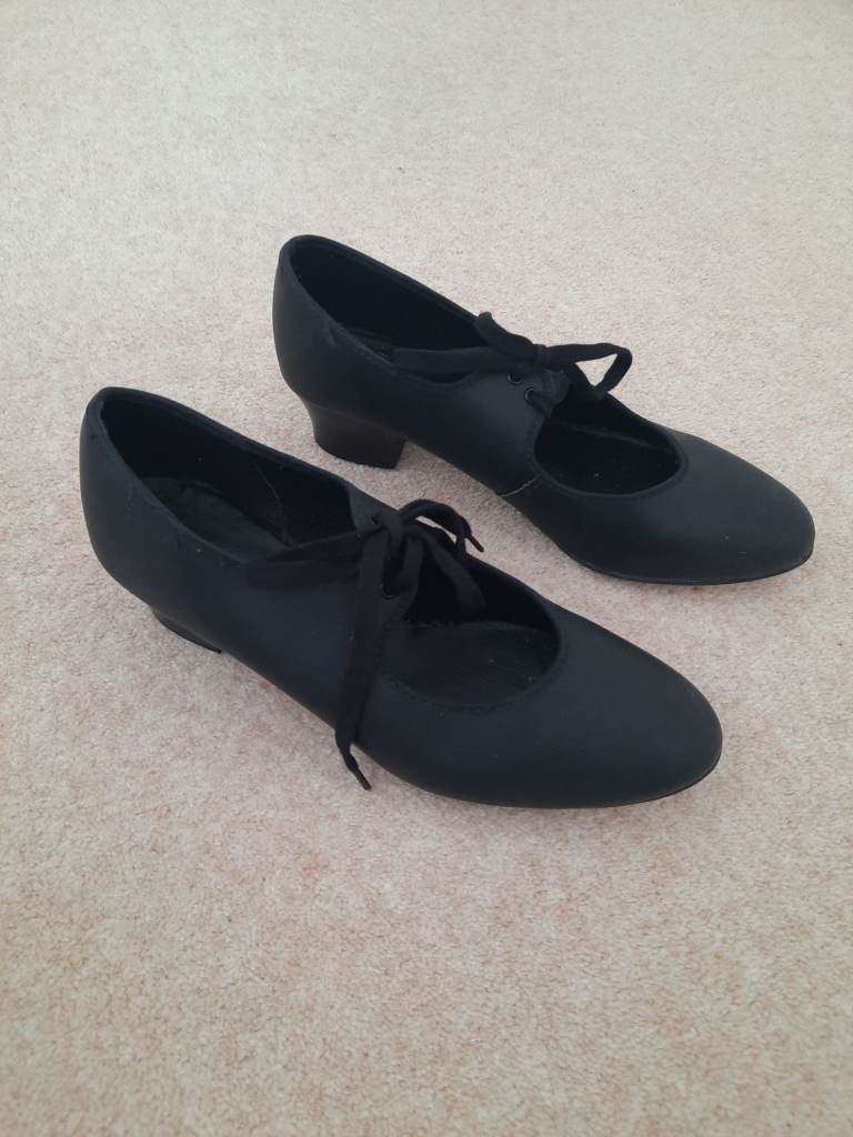 Black tap shoes with laces. Adult size 7. Ideal for beginners. Used, but in good condition.