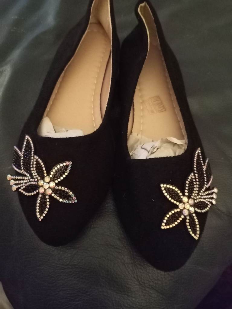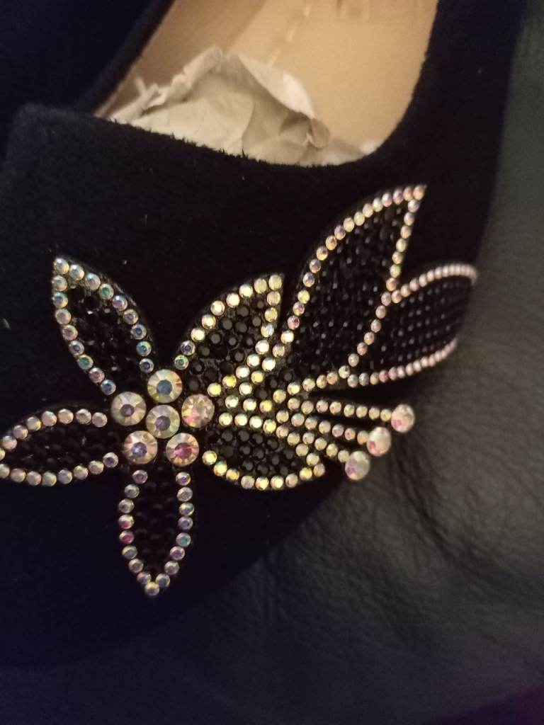 Black velvet shoes with crystal flower design on the front
