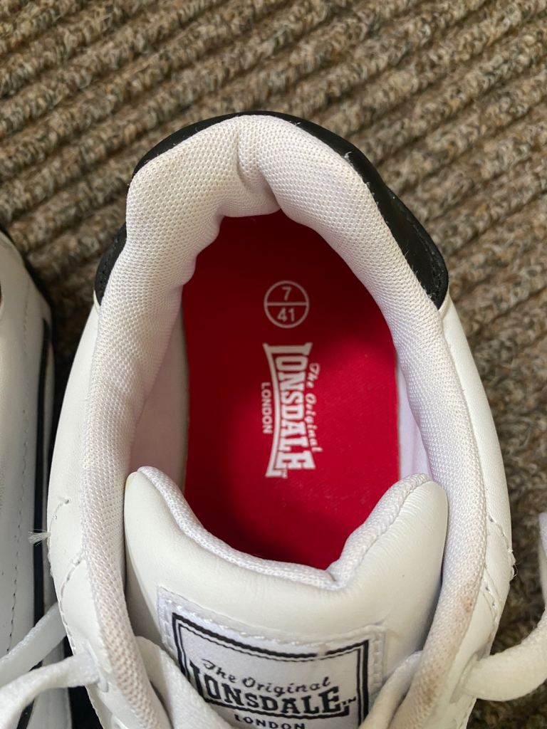 Ladies Lonsdale ‘Camden 30’ trainers. Worn once. White with black detailing. Very good condition. Size 7. Buyer collects please.