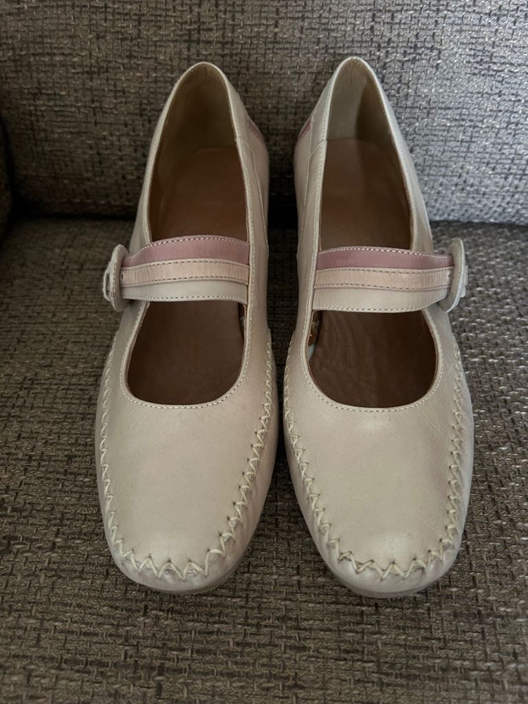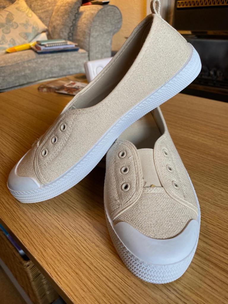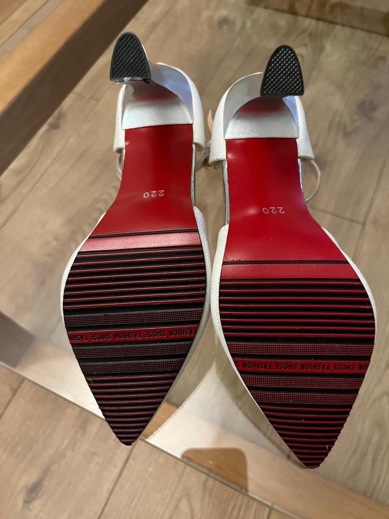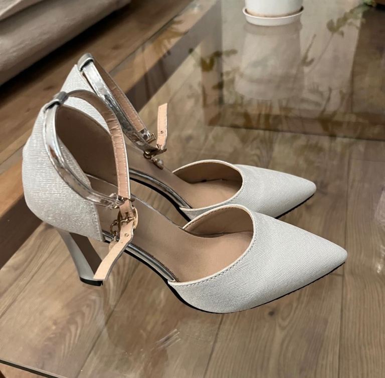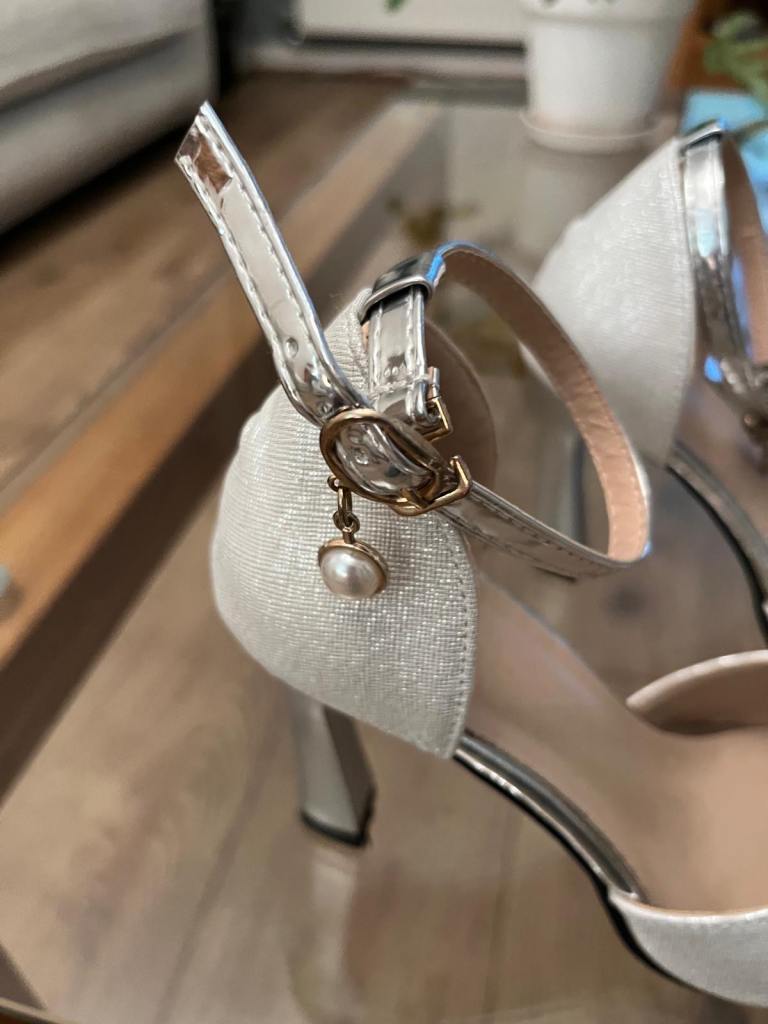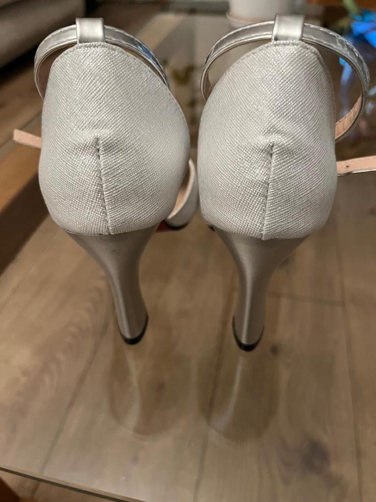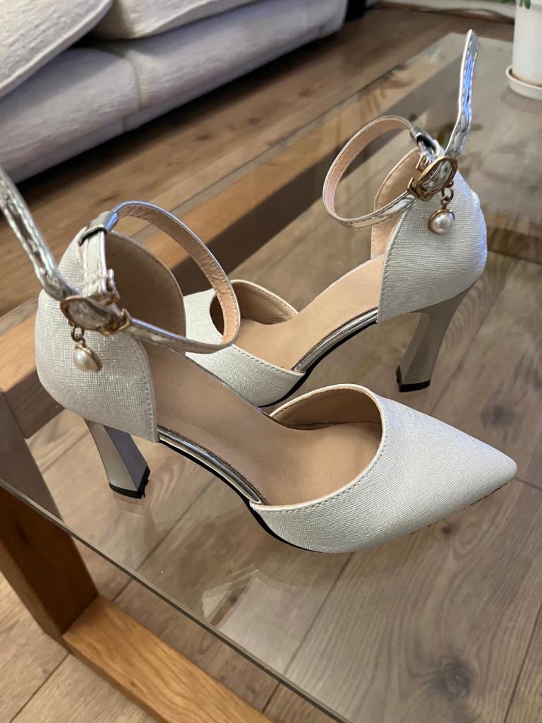 A pair of unbranded glittery silver heeled shoes. Metallic heel with pointed toe and sleek ankle strap and buckle hook fastening with pearl drop. Never been worn so in perfect condition, no marks or scuffs. Size isn’t labelled but they fit like an estimated size 2. Ideal for parties, weddings, special occasions.