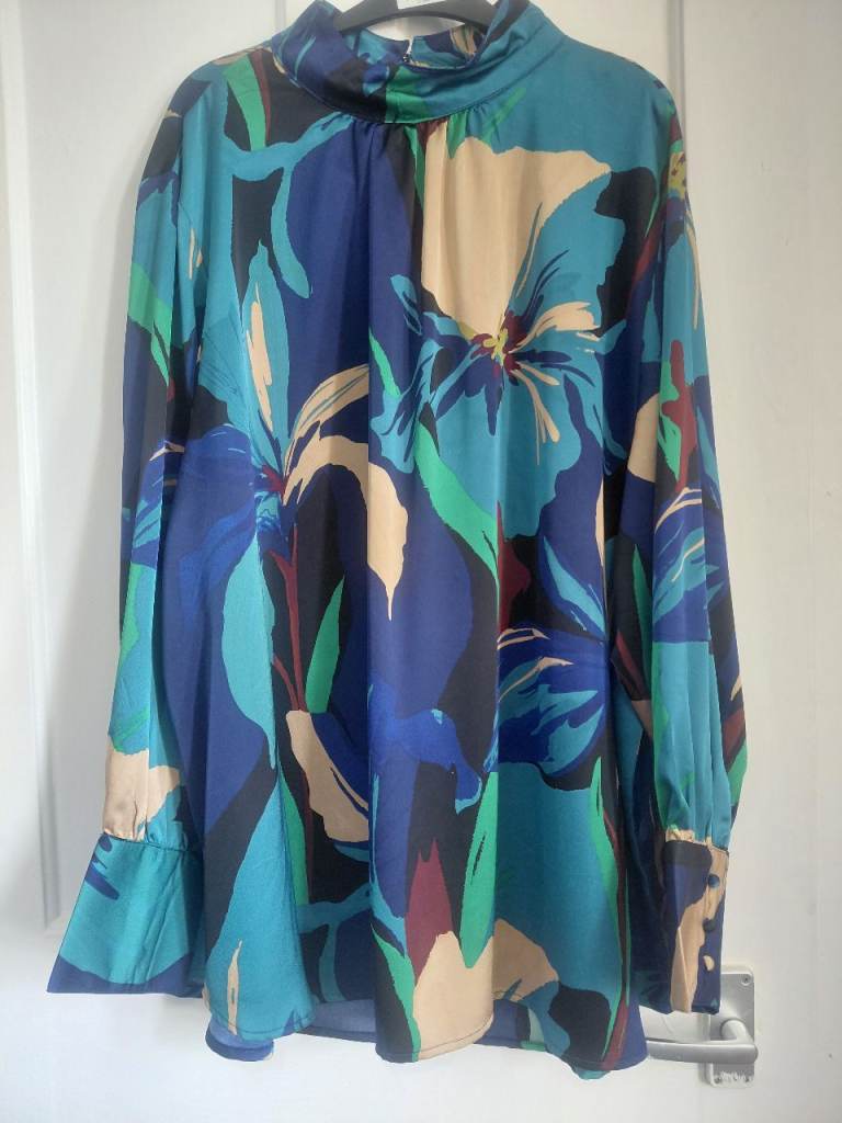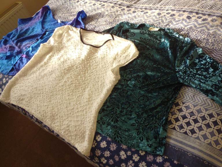 3 ladies tops. on left of main pic-- blue rima made top XXL. 100% terivoile. sleeveless, button up. vgc, fresh. white capped sleeve top, size 20, made by atsmophere, sparkly sequins. plain on back. cant see washing label???? lastly sleeved, eastex made, size 20, turquoise? top 60% polyester, 30% polyamide, 10% spandex. vgc. all in fresh, clean condition, collection from bournemouth bh9 area. any questions pls ask. thks