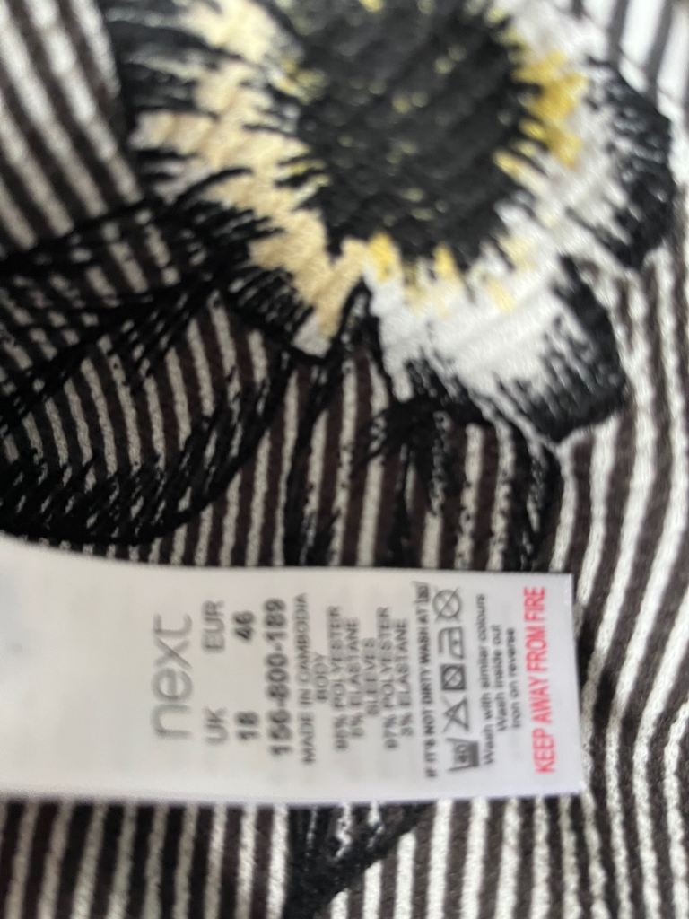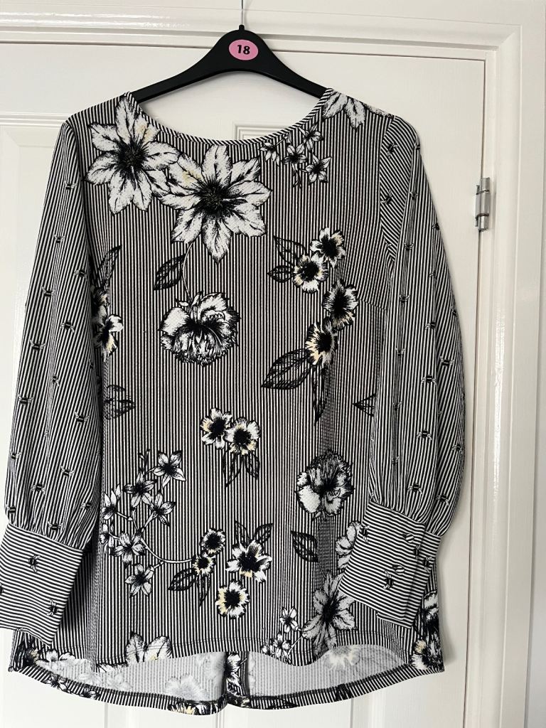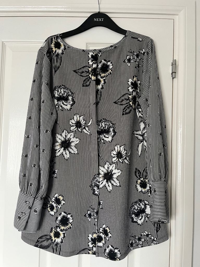 Bees and flowers long sleeved black and white blouse with deep cuffs and covered buttons