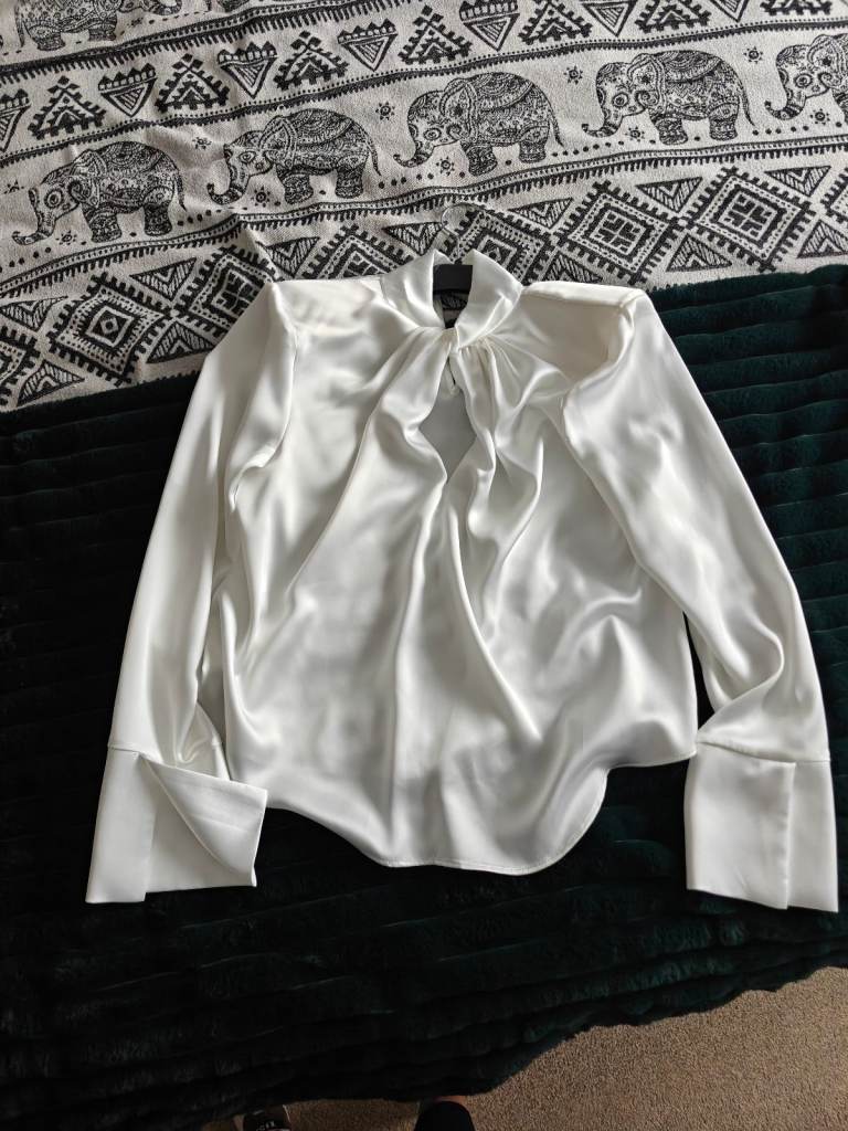 Very beautiful blouse. Feels like satin. Very elegant! Off white colour.