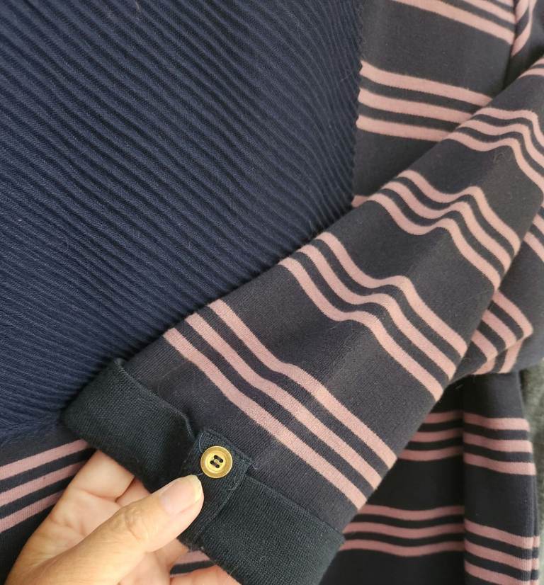 Three-quarter length sleeves have cuff and button at the end for decoration