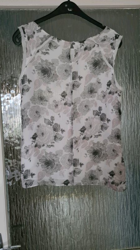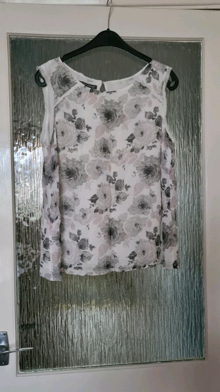 Floral grey/pink/white top. Light with distressed edges around armholes. Collect or can post. Size 16