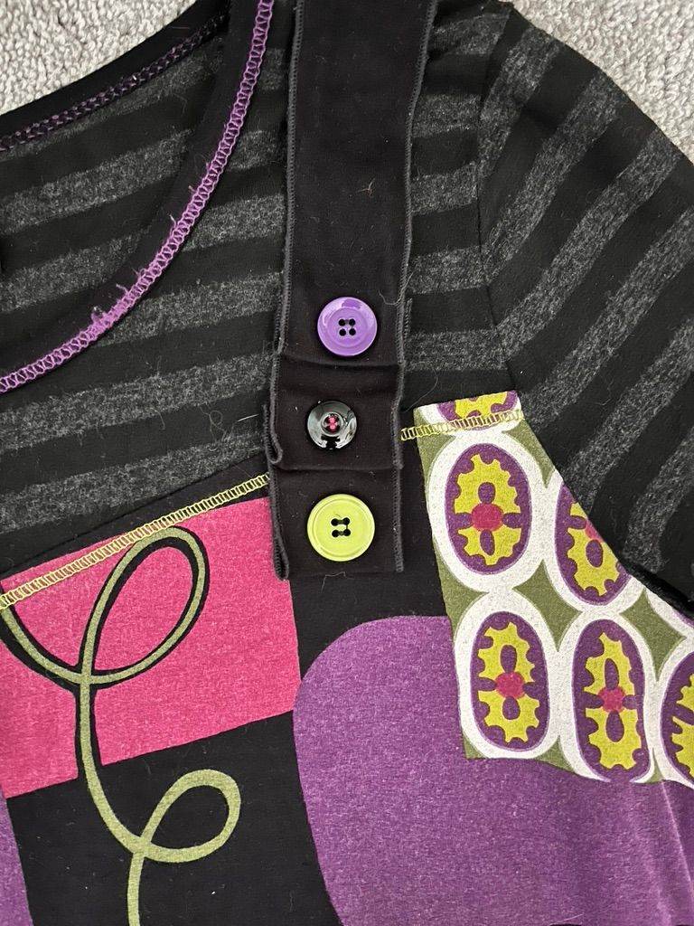Left shoulder has 3 button design - purple black green