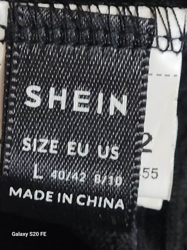 This is a used SHEIN black long sleeve crop top in size Large (L) (EU 40/42, US 8/10). The top features a stylish ribbed texture and an alluring off-the-shoulder or Bardot neckline.