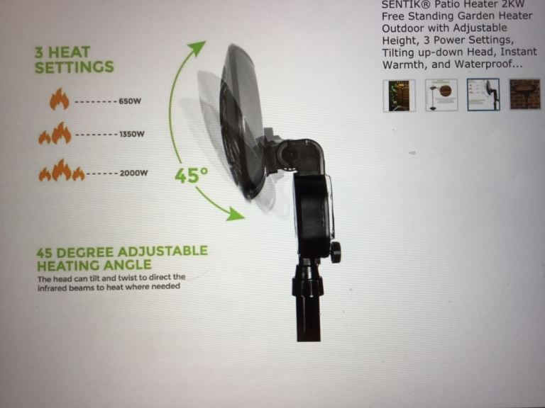 It has a 45 degree tilting either up or down Quartz Heating element. Direct the heat exactly where you want it.