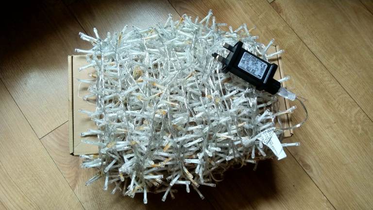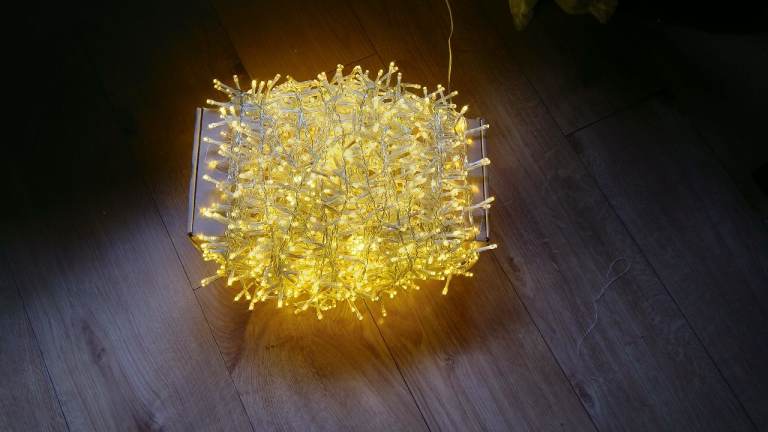Gorgeous fully working warm white fairy lights with 2000 LEDs spread over 50m length. Can be used indoor or outdoor. 8 modes. Used only once over Christmas in the garden, now detangled and neatly wrapped around a box for effortless setup.
