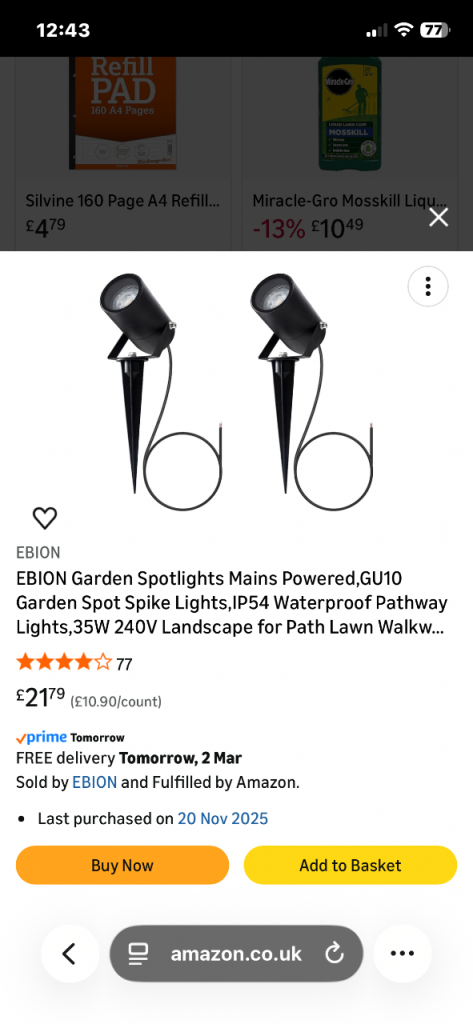 Ebion garden spotlights 2 X Twinpack so 4 lights altogether. Brand new in box, just changed mind and bought fence ones instead.