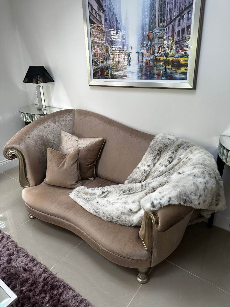 Beautiful curved chaise lounge in a soft champagne/taupe velvet finish, featuring elegant gold accent detailing and classic scroll arms. This piece adds a touch of luxury and sophistication to any living room, bedroom, or dressing area.