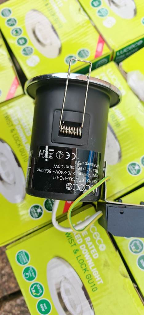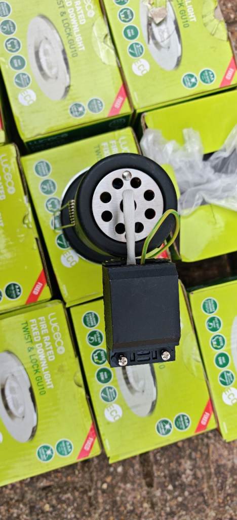 Brand‑new Luceco fire‑rated fixed downlights in polished chrome finish.