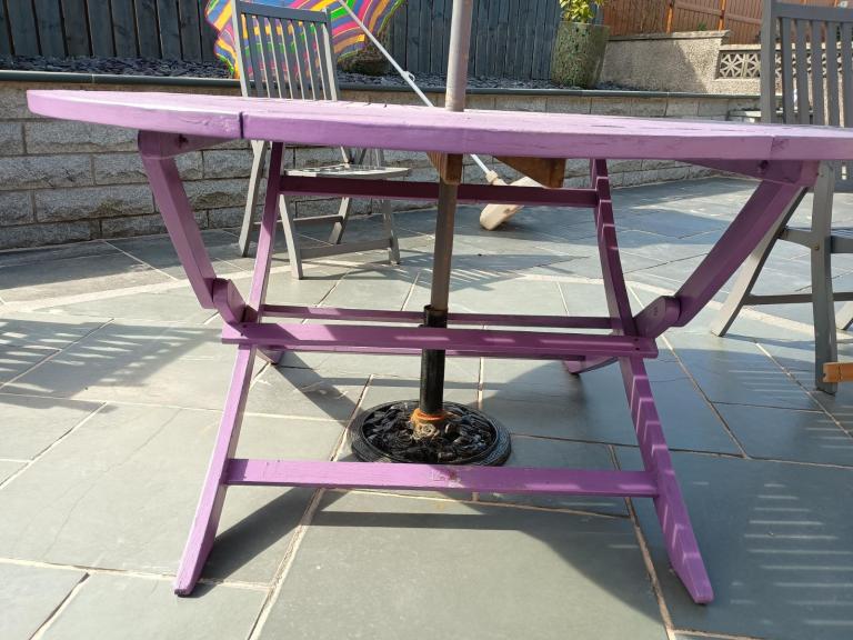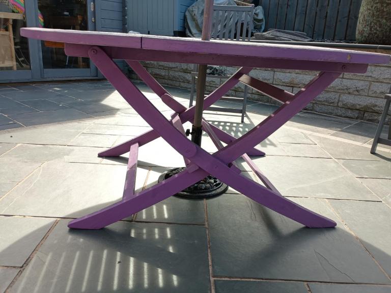 150 cm wooden garden table painted in light purple protective coating, some minor restoration required (light sanding and touch up).