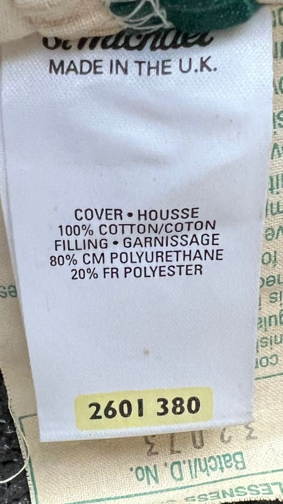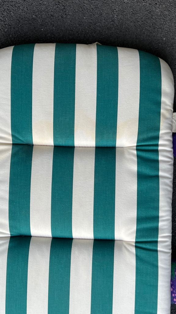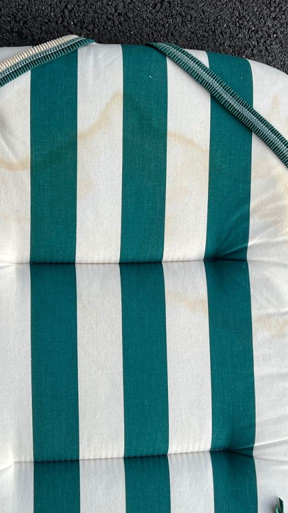 These have had very light use but have been in storage for a long while. Generally, they look very clean but there is some water staining to the back of one cushion at the top (pic 2) but this doesn't show much on the right side (pic 3) - may come out with a sponge or fade if left in sunlight.