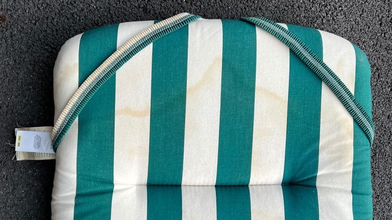 2 green and white striped garden chair cushions from M&S.