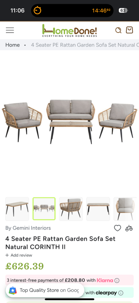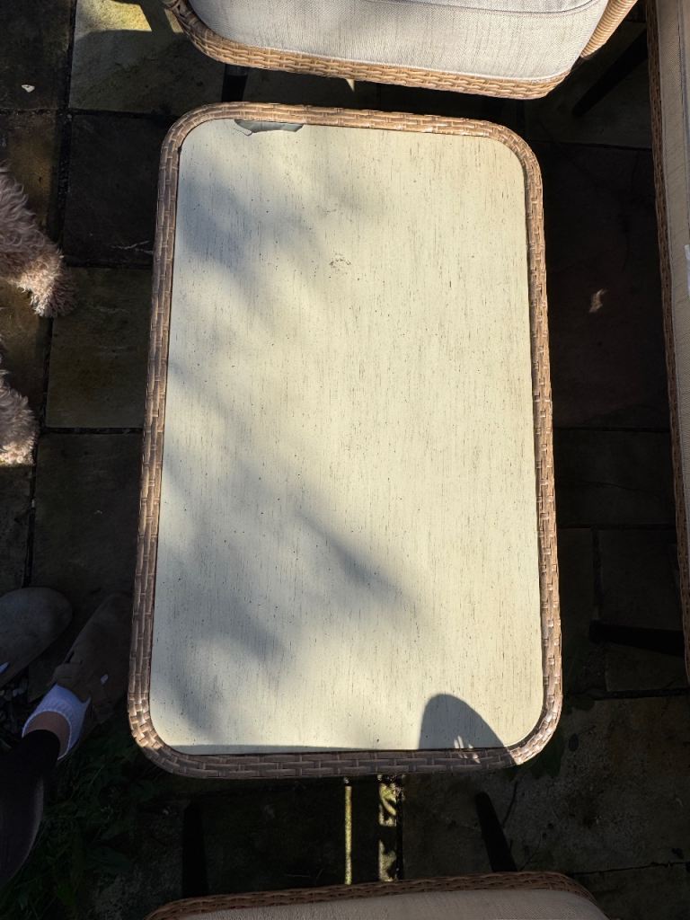 4 person rattan coffee set for outdoors. Bought end of summer last year so hardly used. Very comfy - paint lifted slightly on table but otherwise great condition (see picture). Bought for £600