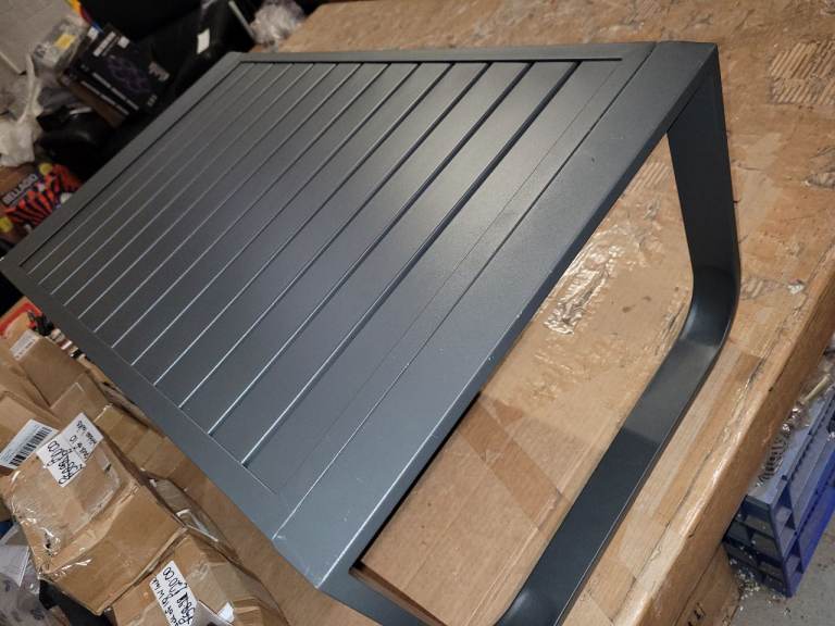 A new ( slight seconds ) charcole grey metal garden coffee table with slatted design top the measurements are enclosed in the pictures we are selling it for 20.00 collection only it is st aidens Church summer Bank Road Tunstall st6 5ey we are there mon to fri 9am to 3.30pm Saturday 9am to 3pm closed Sundays with thanks ( we only hold items for 24hours only).