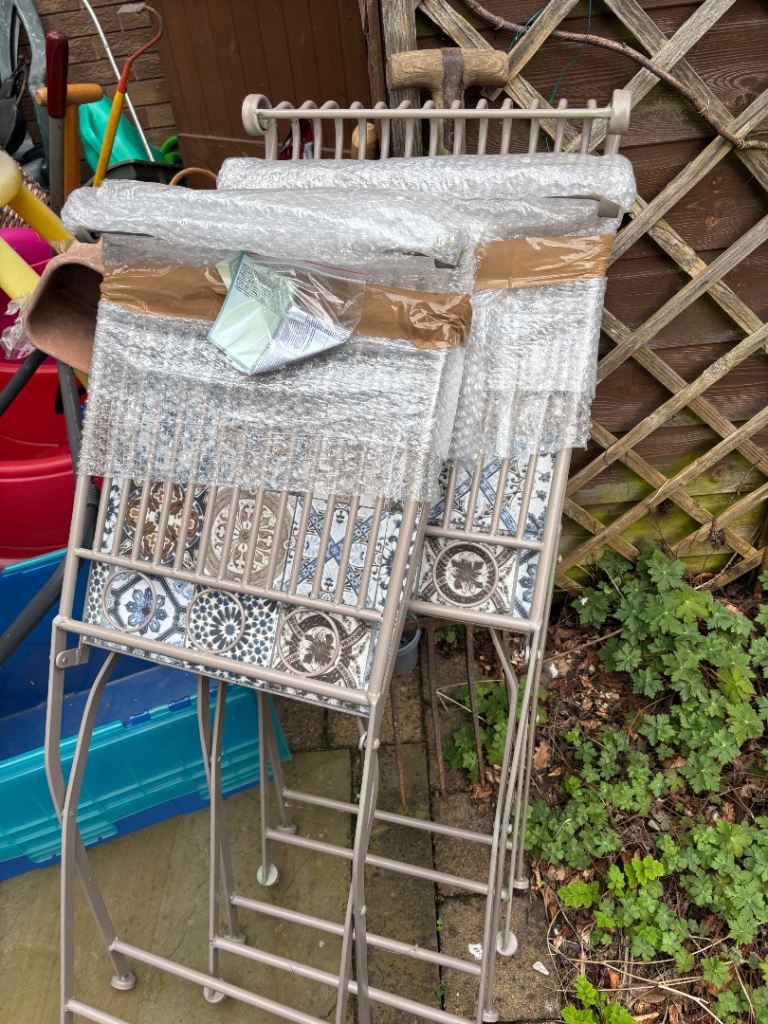 Bistro garden set, four chairs and table. Two chairs still in wrapping. Stored in garage and hardly used .