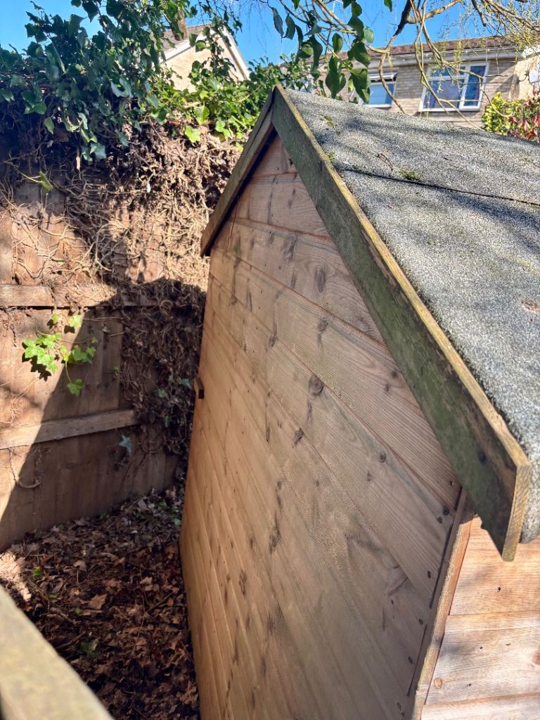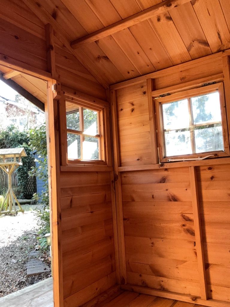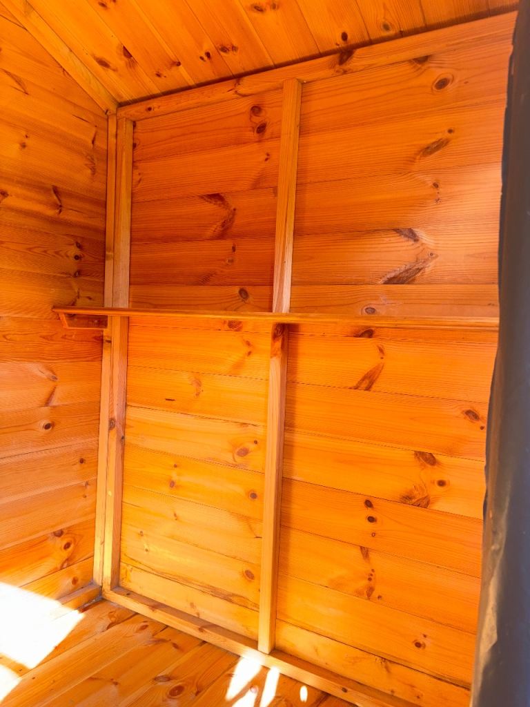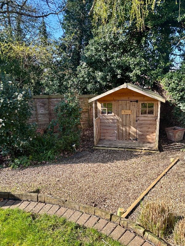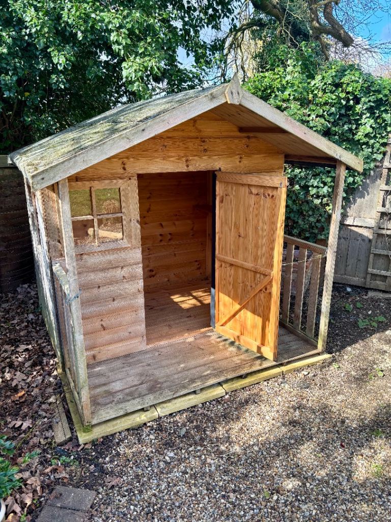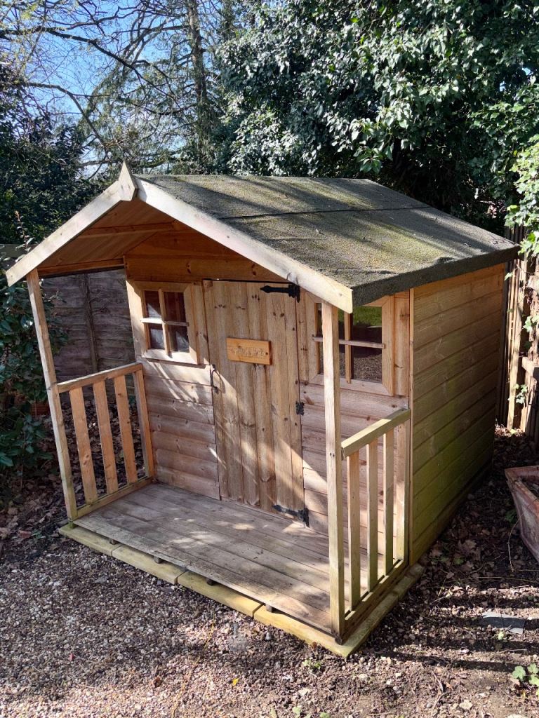 Wooden shed-type construction. Suit small child - door height 1.25mtr. Very clean inside. Weathered exterior but in good condition. Safety strip on door to avoid finger injuries. 3 windows, 1 opening.
