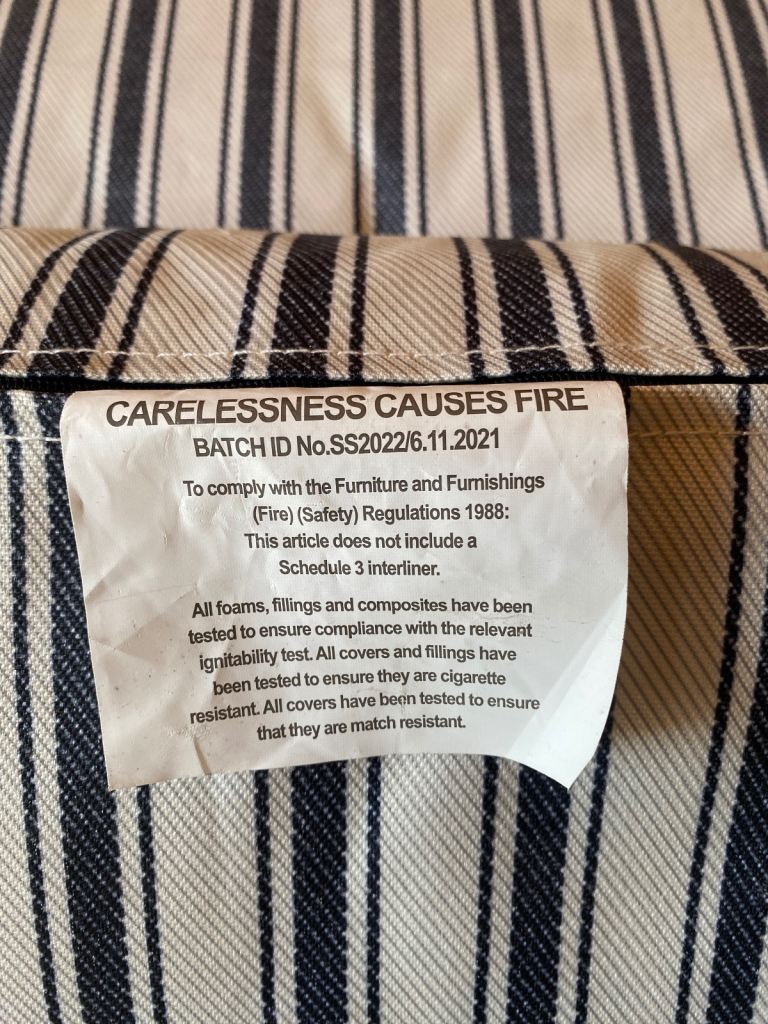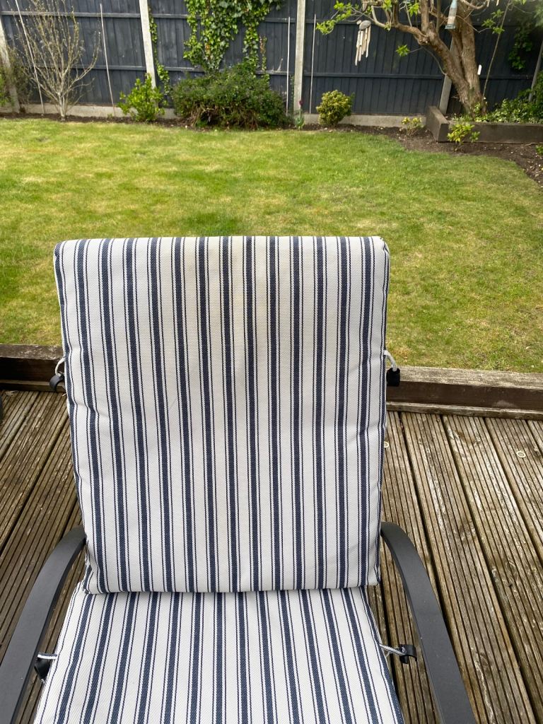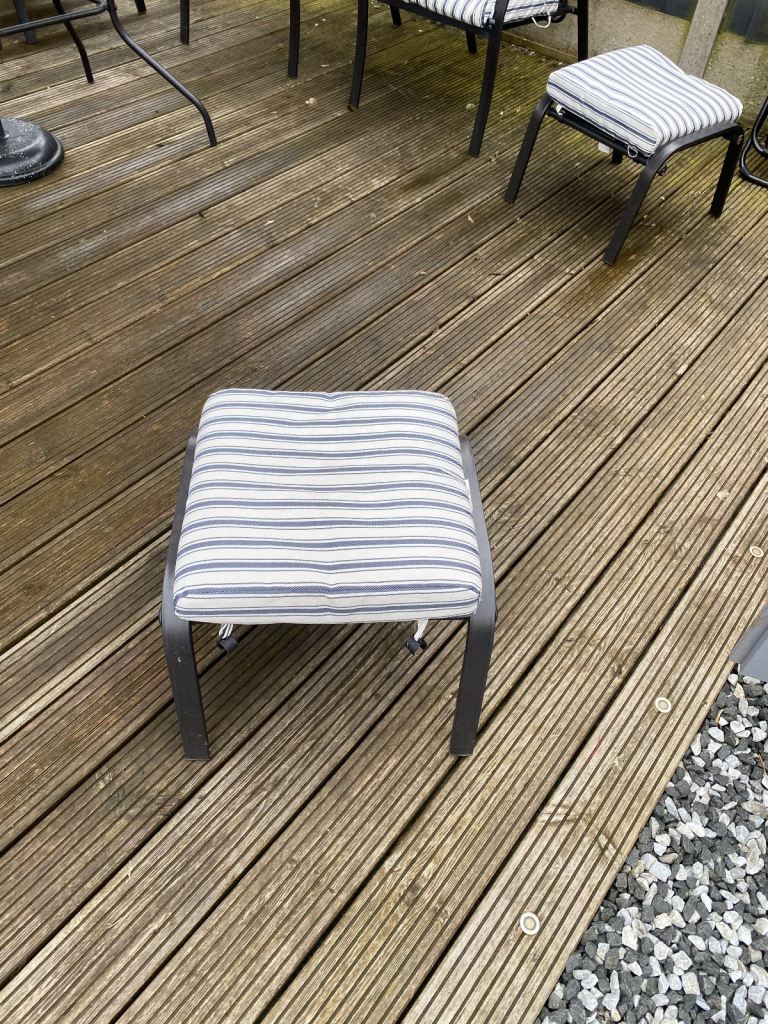 This is 3 years old hardly used and good condition it has a slight sun mark on one of the chair cushions as shown in photo.