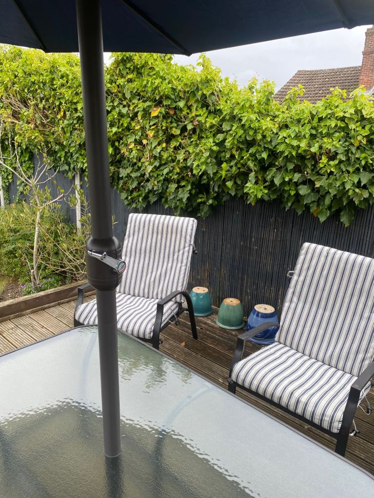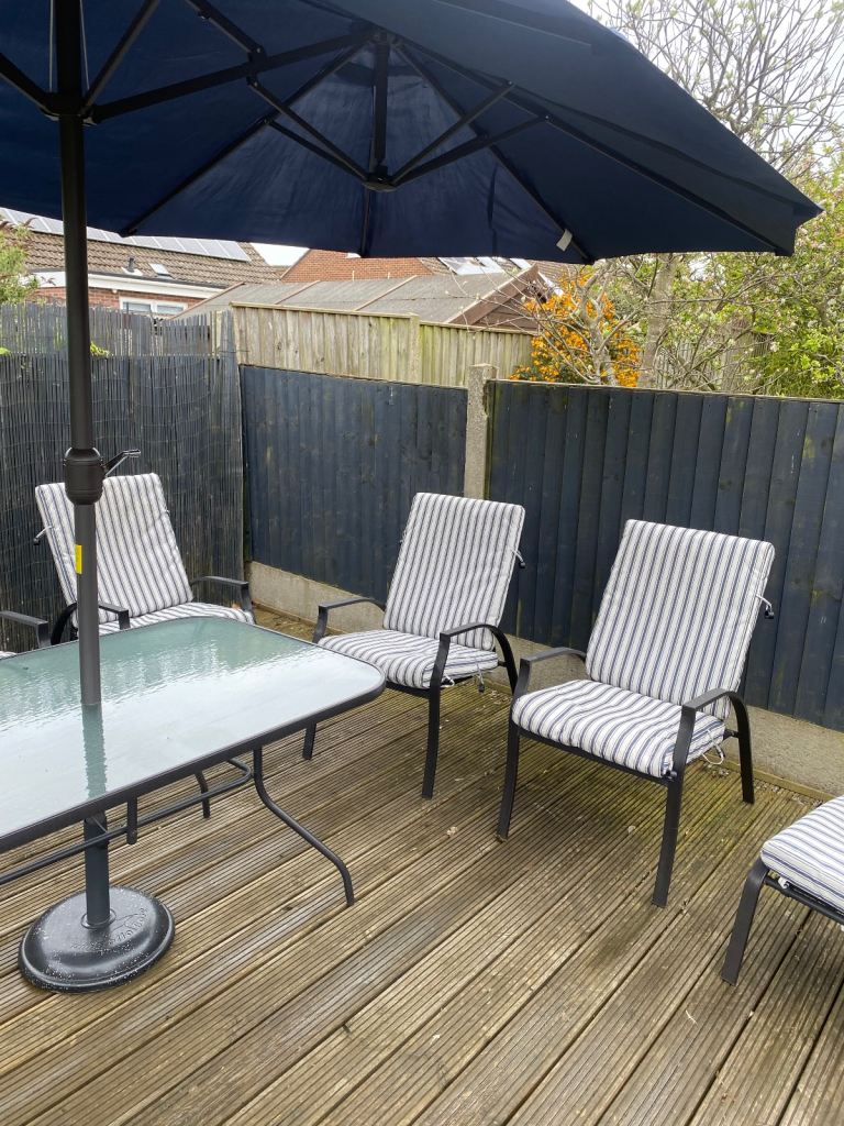 The chairs are all reclining six chairs and two footstools. There is some slight fading to the parasol/sun shade. The table is glass and metal and measures. 1m 420 mm long x 920 mm wide x 710mm high. You would need a big van to collect it all in. It cost £900 when new. I’m looking for offers as near to £250 buyer collects as postage would be very expensive.