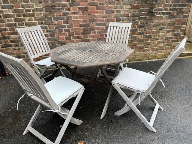 Octagonal garden table and four matching folding chairs. One non-matching but similar folding chair available if required free of charge.