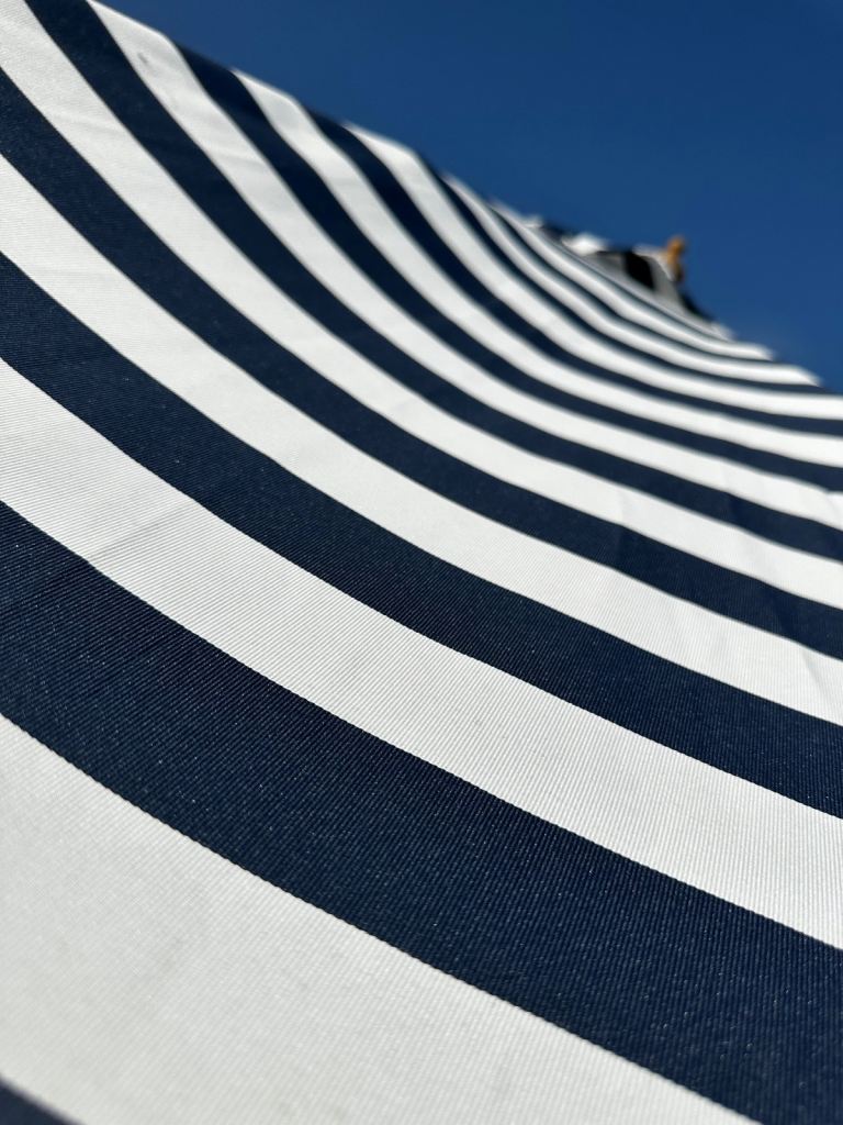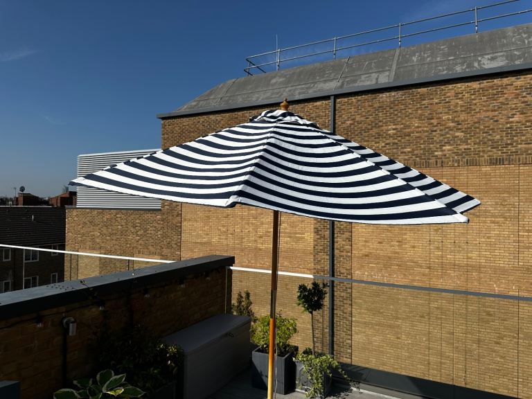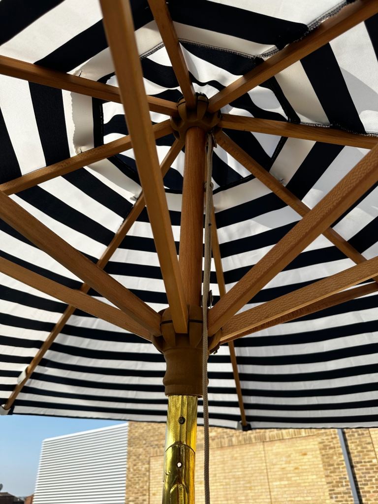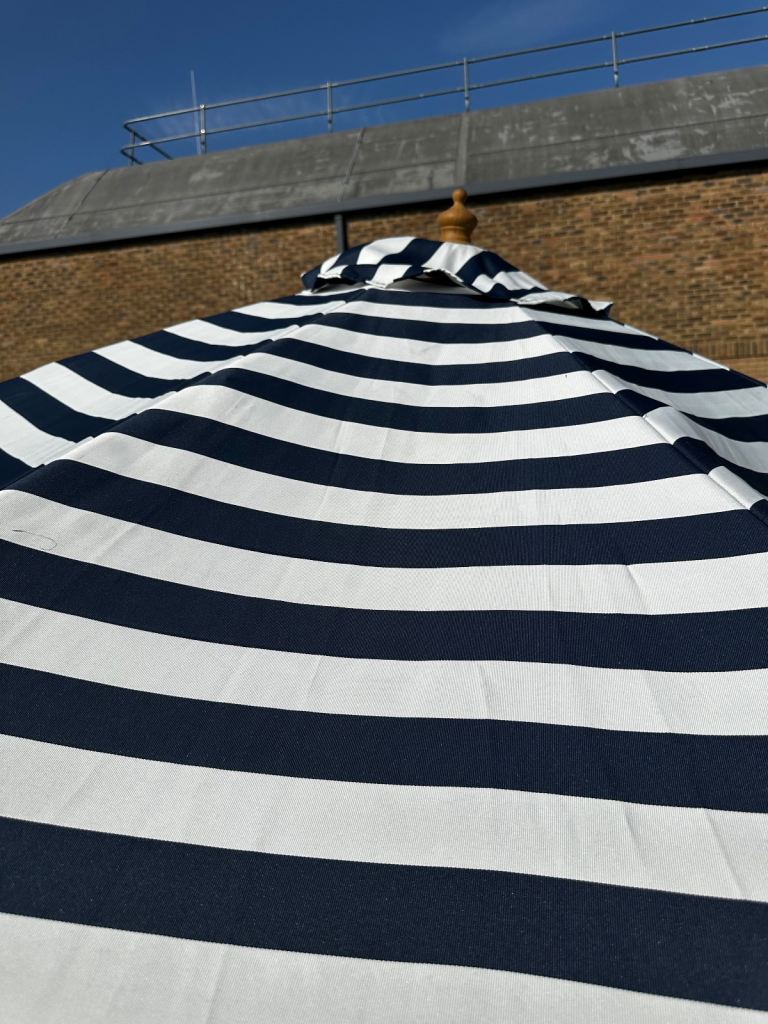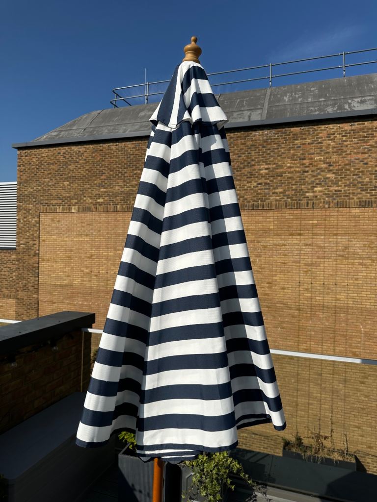 Stripes, wooden garden parasol, granite heavyweight base (25kg) and zipped heavyweight fabric storage cover.