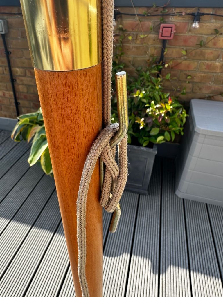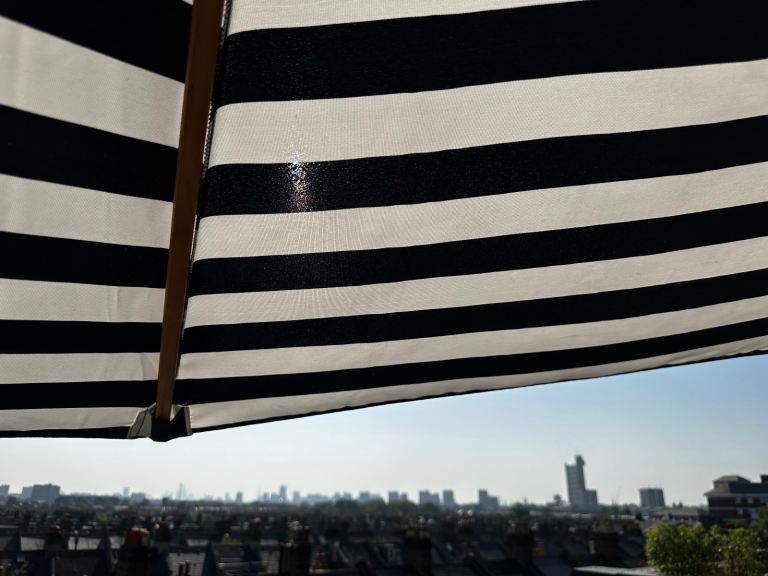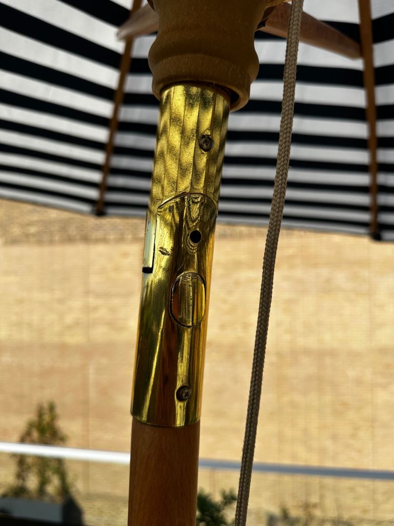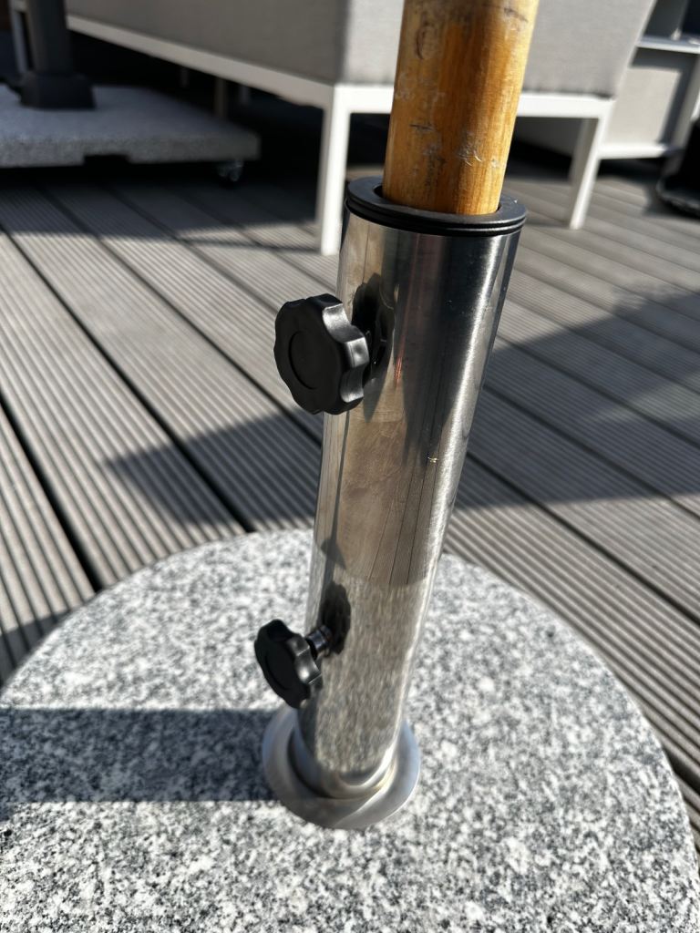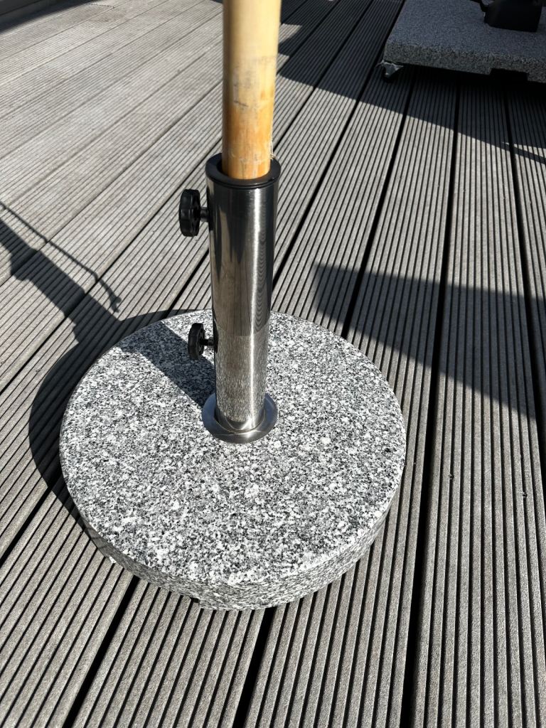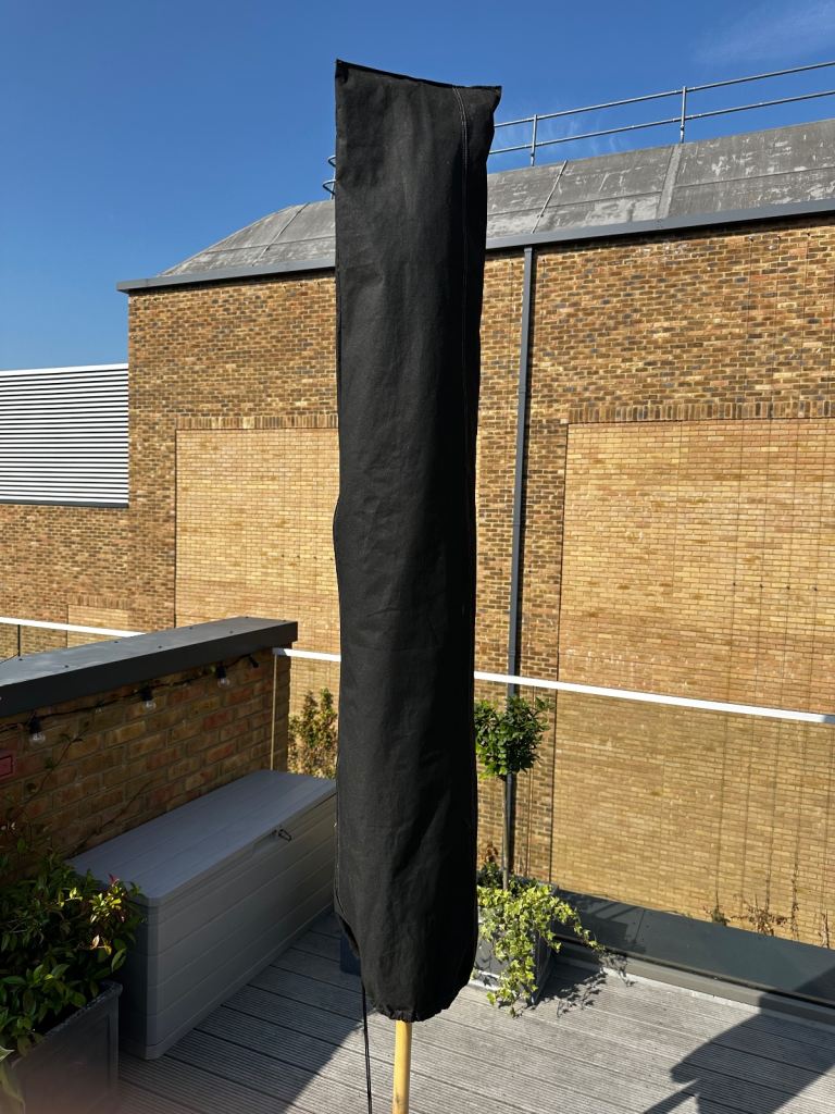 Stripes, wooden garden parasol, granite heavyweight base (25kg) and zipped heavyweight fabric storage cover.