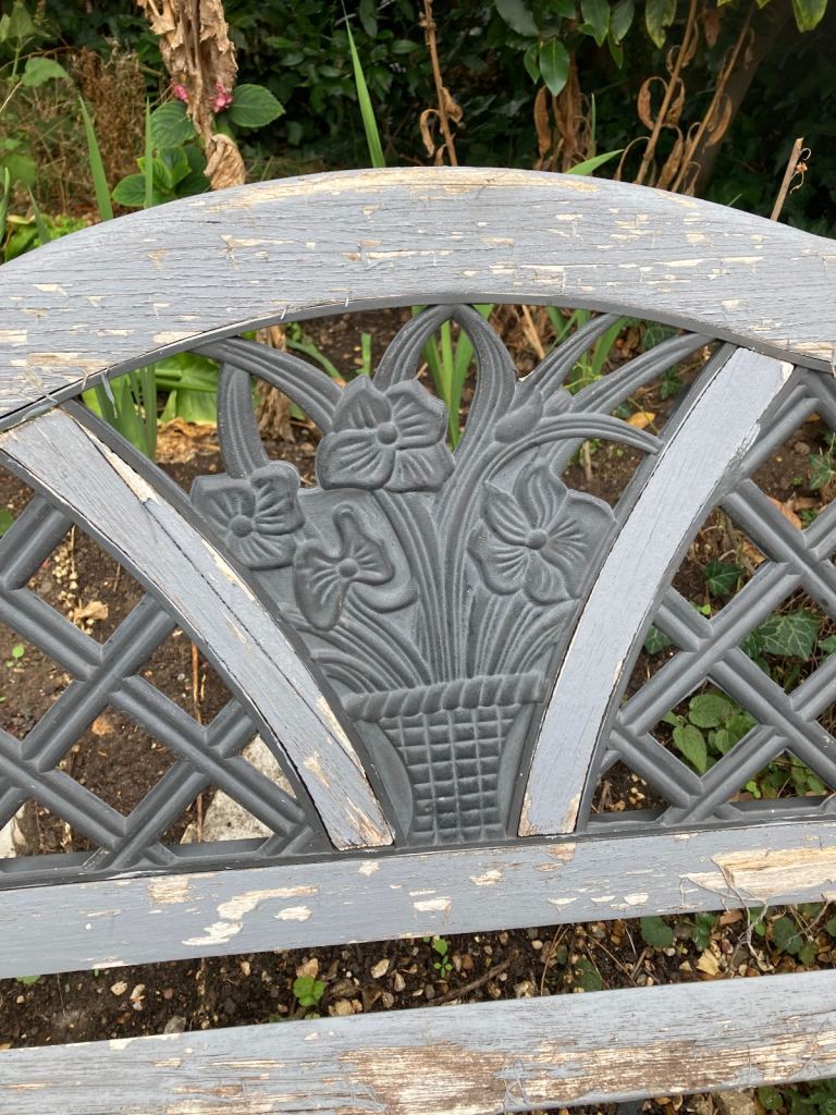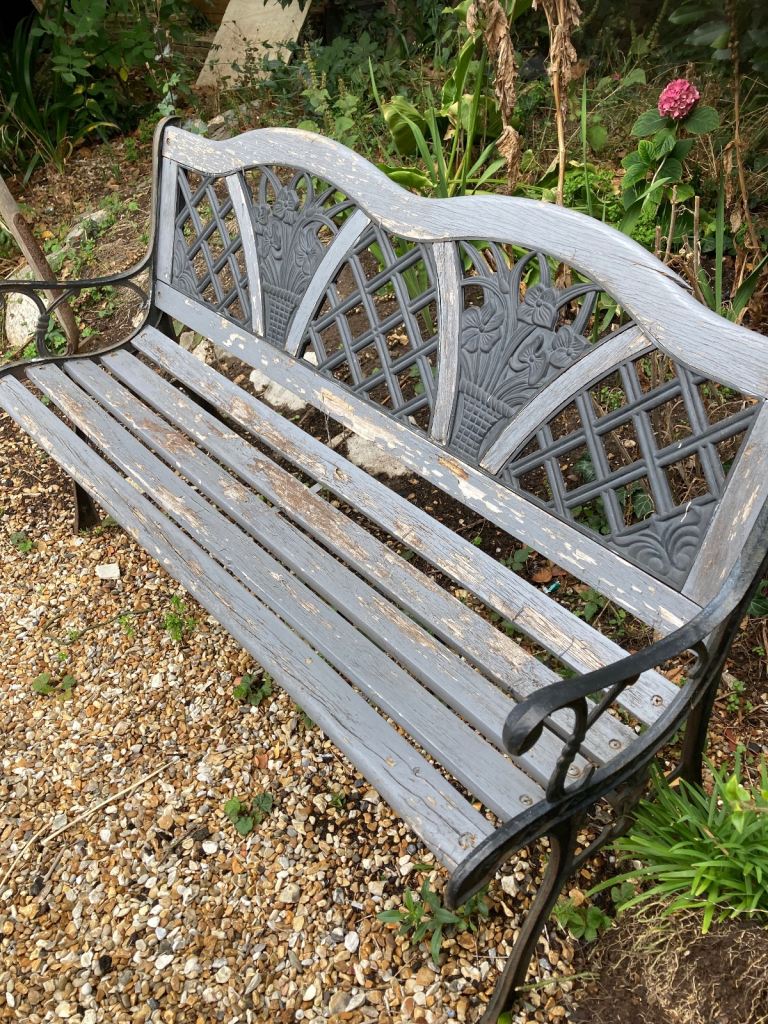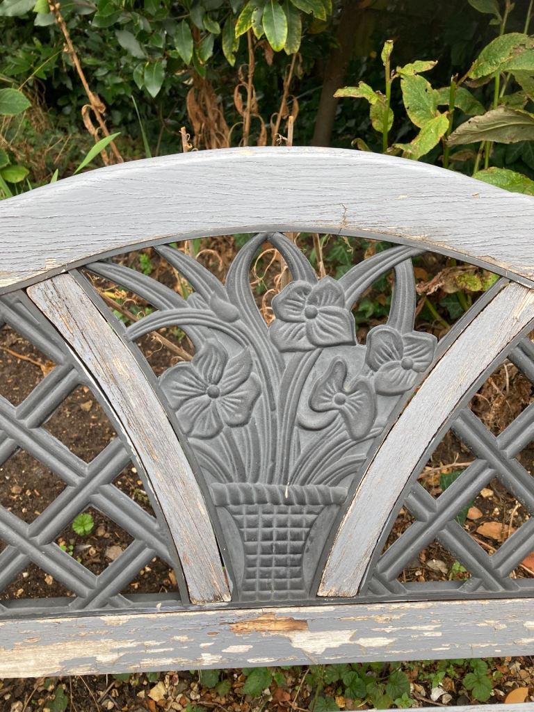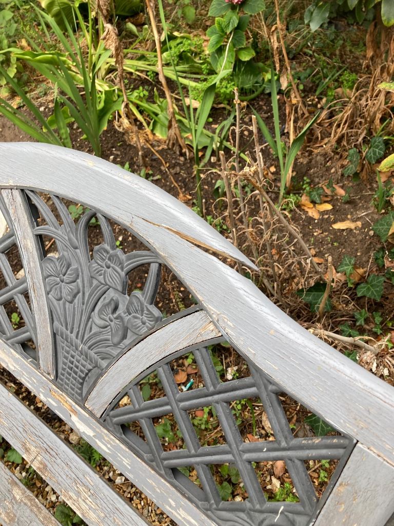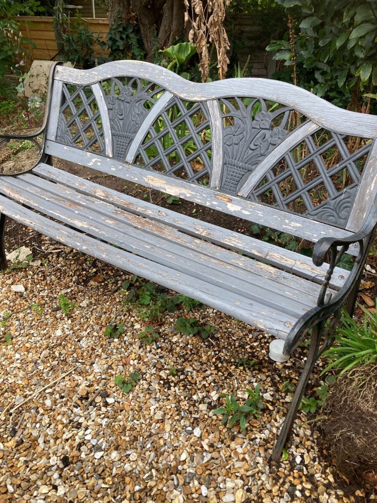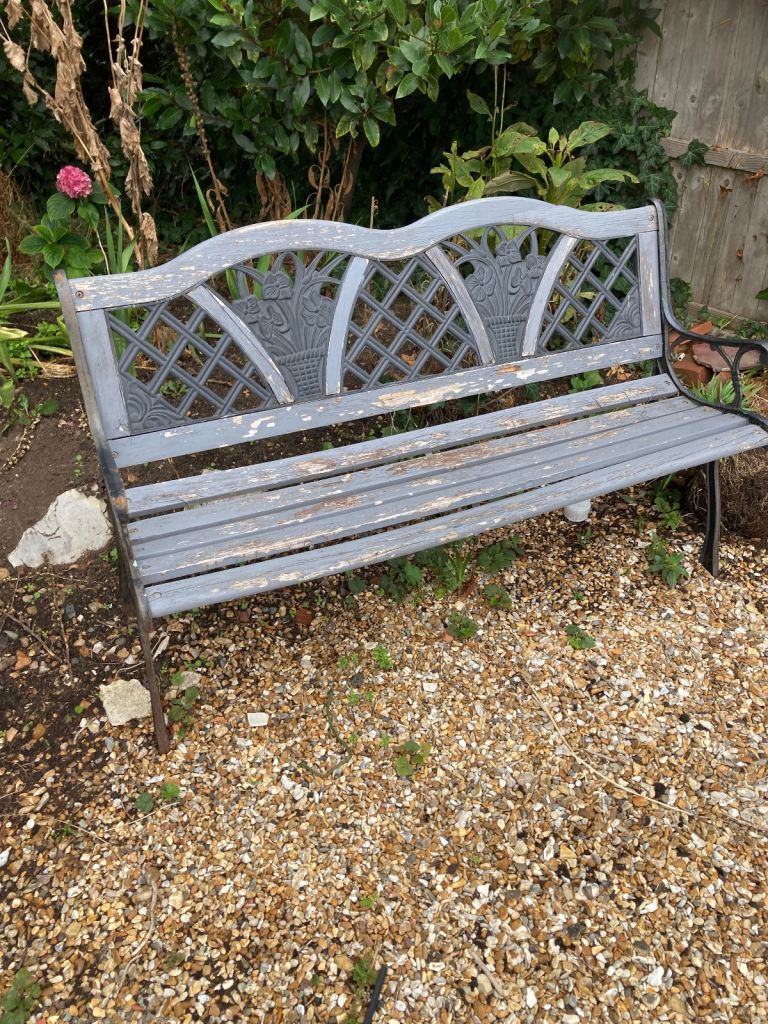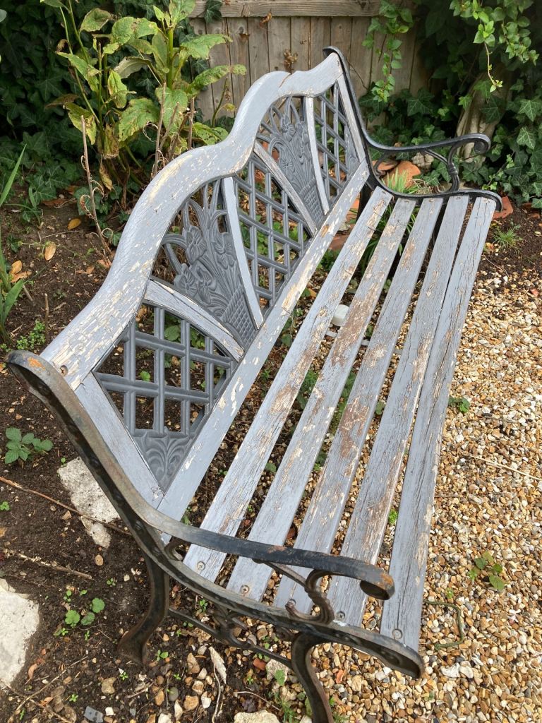 Wrought iron Garden Patio Bench plastic insert on back 49 inches long 28.5 inches high 17 inches at base needs a little tlc but very useful Collection only