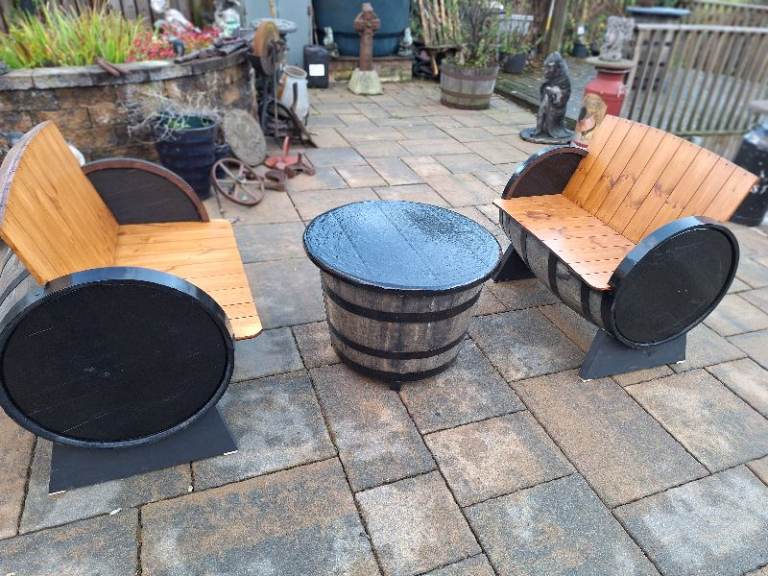 Lovely oak barrel garden furniture made from 1st class freshly emptied oak barrels seats are around 36 inch wide,circular table with concrete top which has a lovely wood grain effect, painted and laqured..£320 for 2 seats and table or its £370 with the 2 matching stools added..delivery available, we are based in Draperstown..