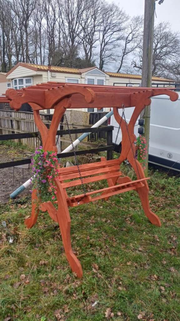 Beautiful handcrafted solid wood garden swing with pergola frame.
