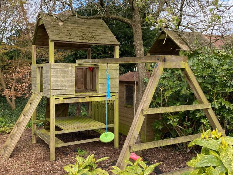 Posting for 10+ yearsGarden Tower Playhouse with attachments, and (separate) Swings