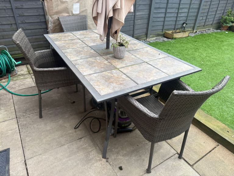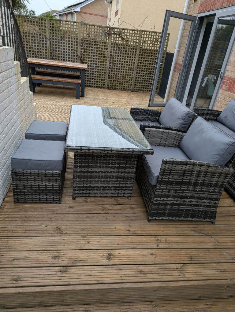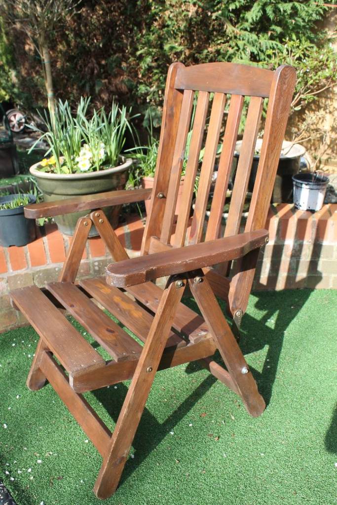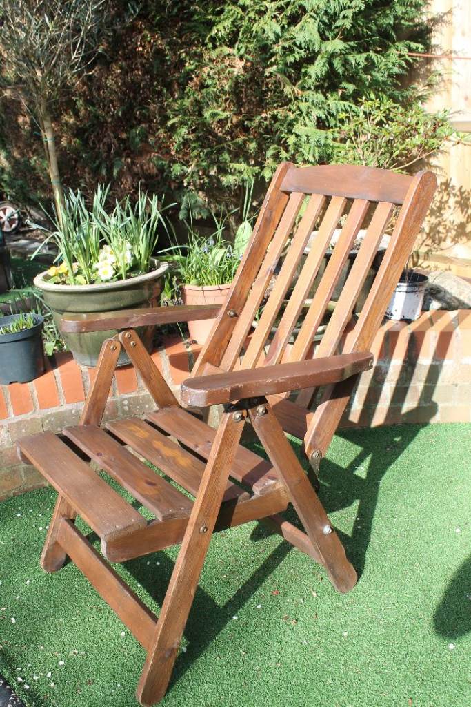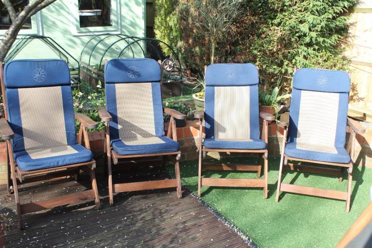 Set of 4 Adjustable solid wood garden chairs. Can be folded for easy storage. Good quality cushions.