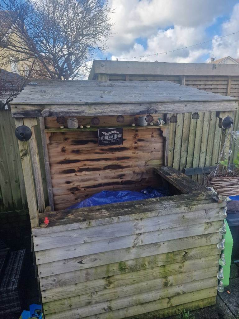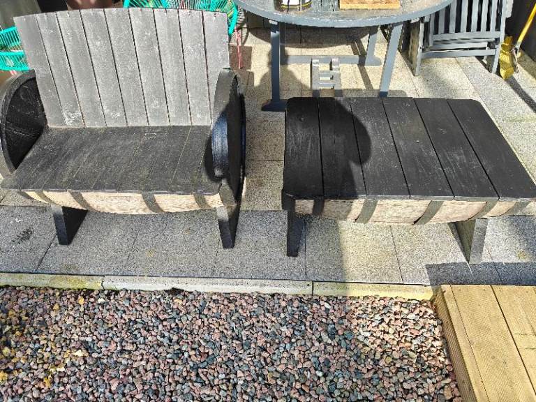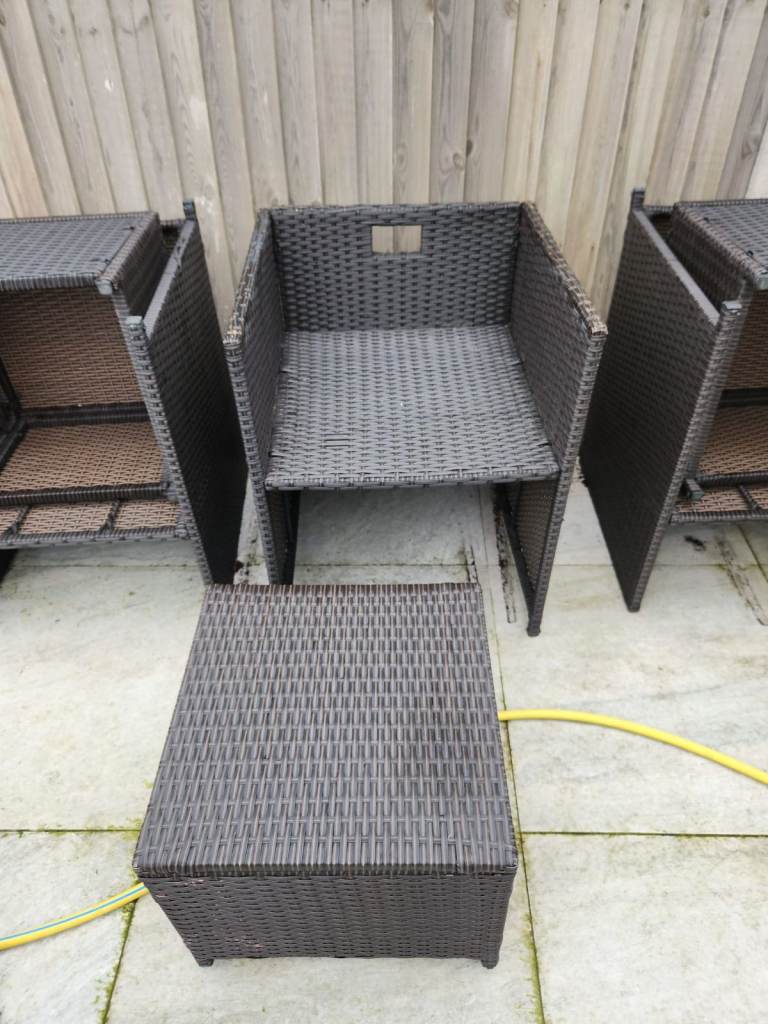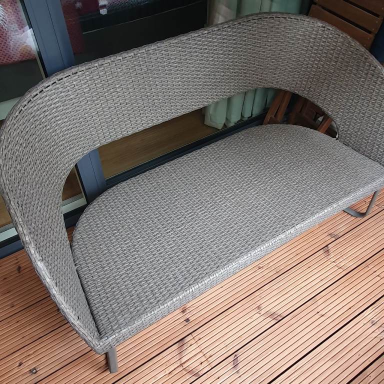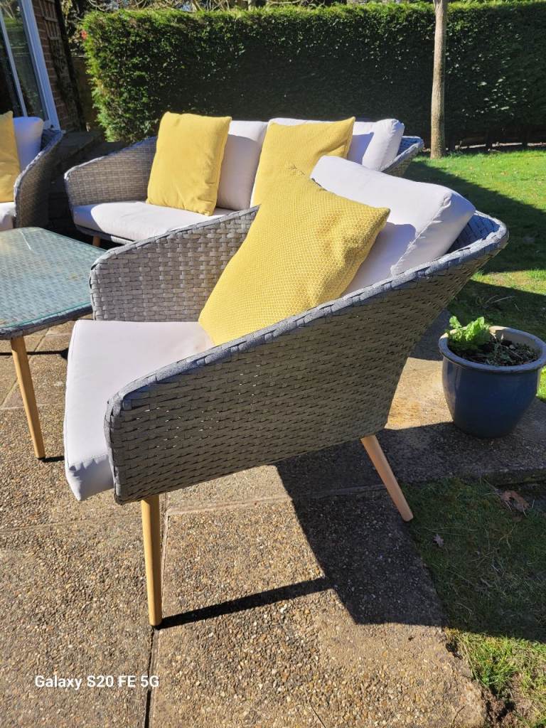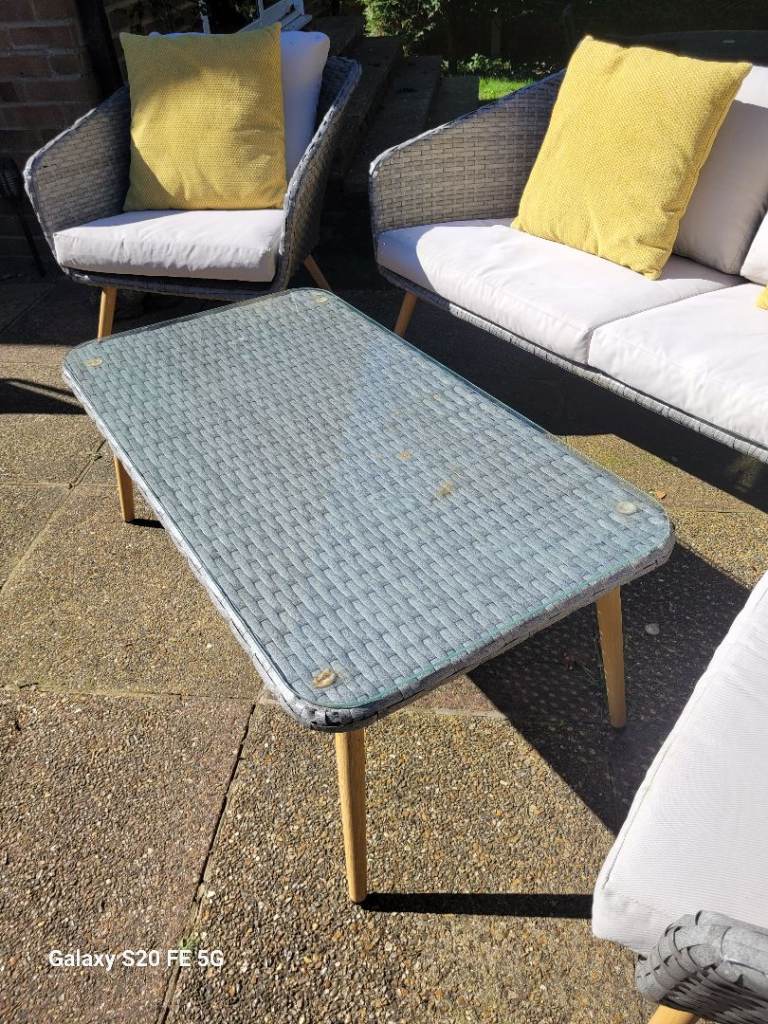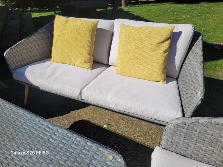 Lovely grey modern rattan garden furniture. Consists of a 2 seater sofa, 2 good sized armchairs, glass topped coffee table and all the cushions. Delivery available