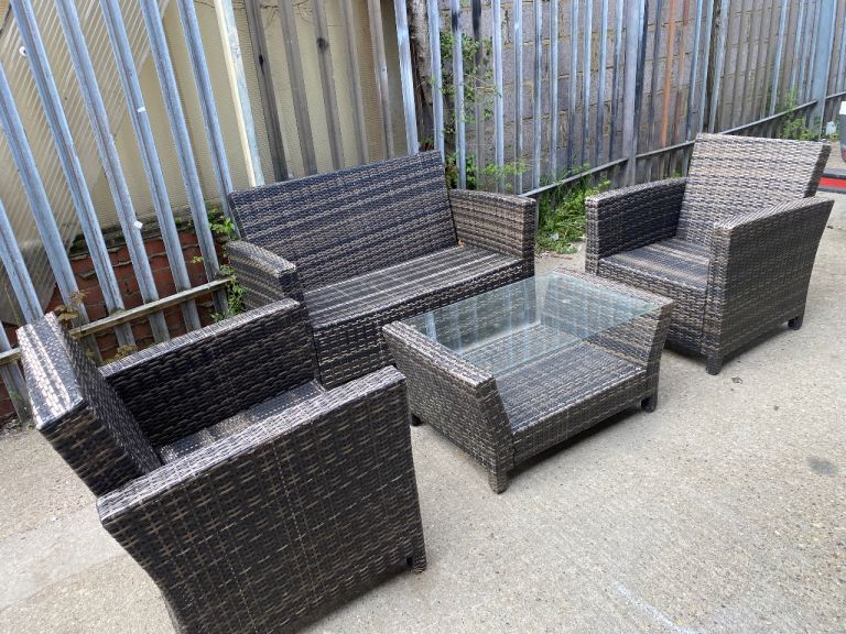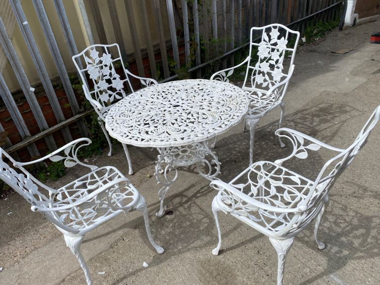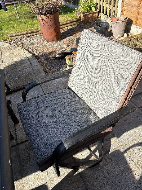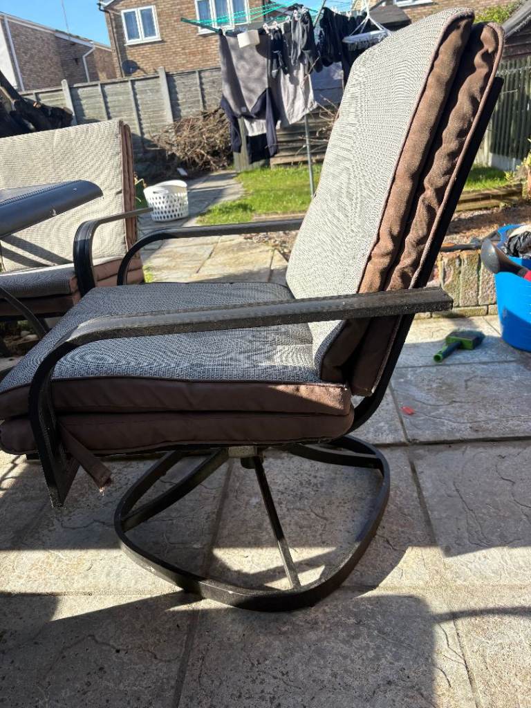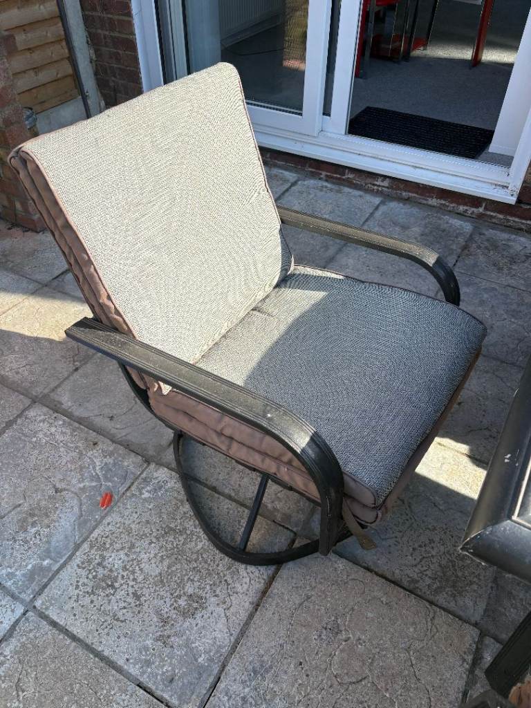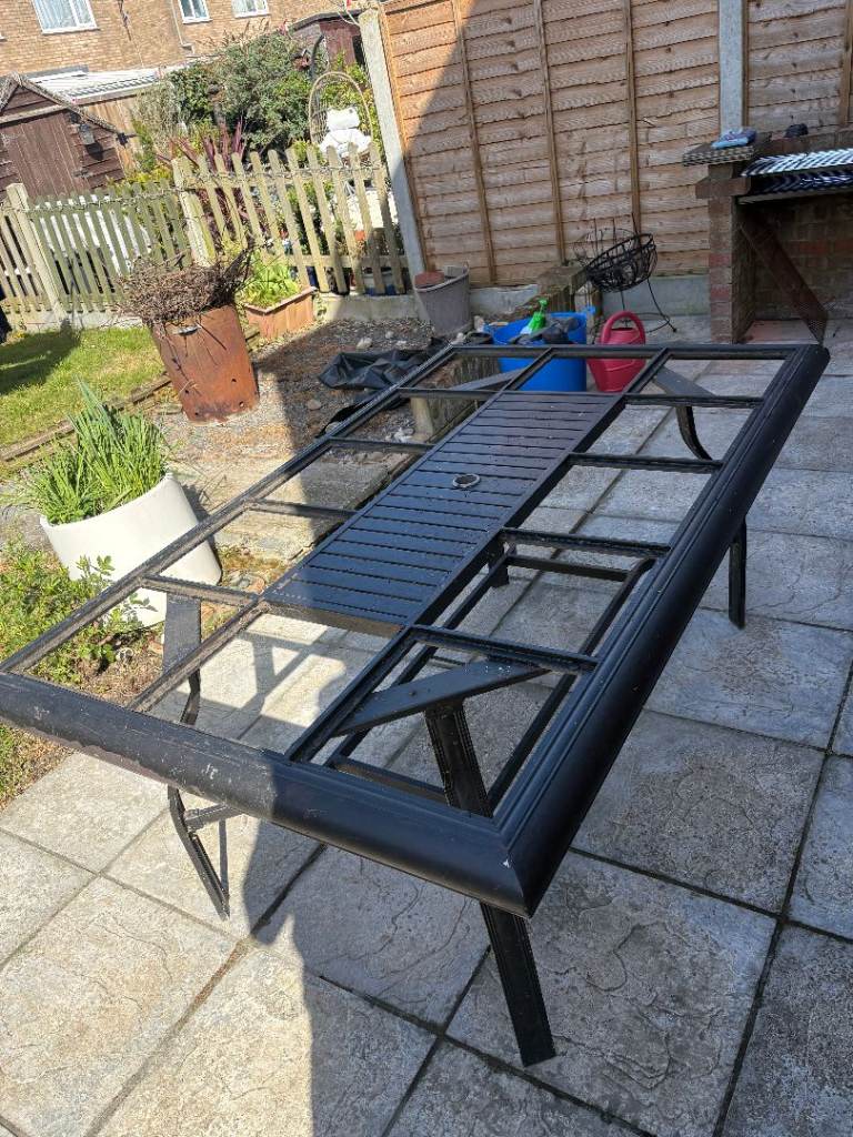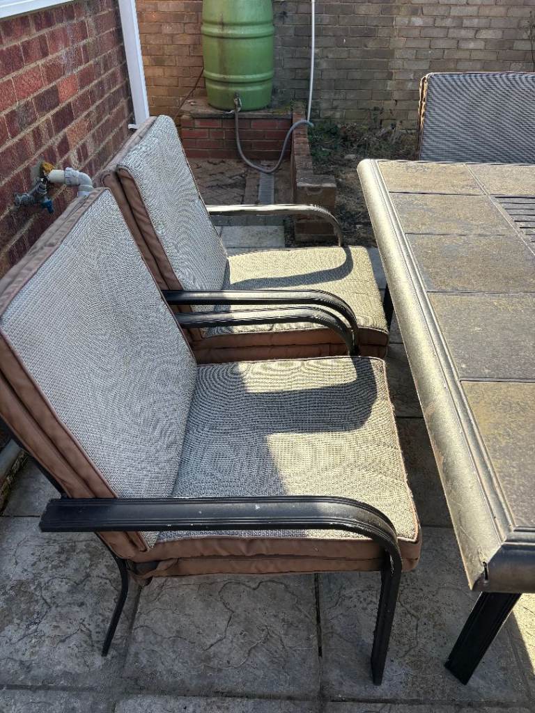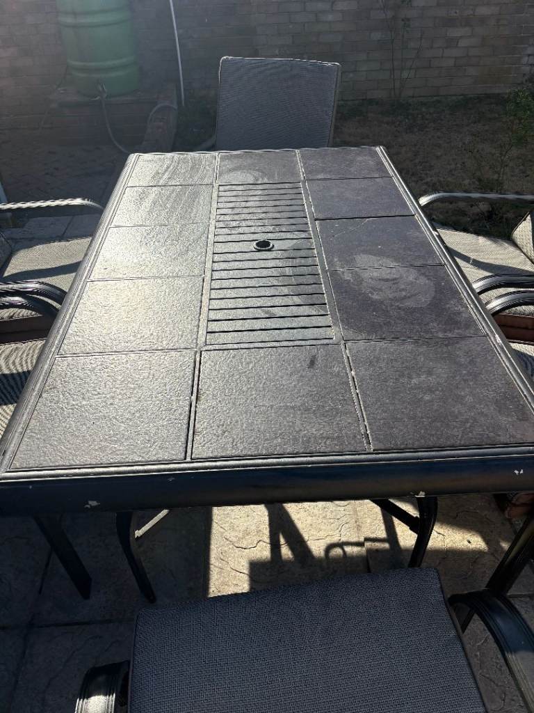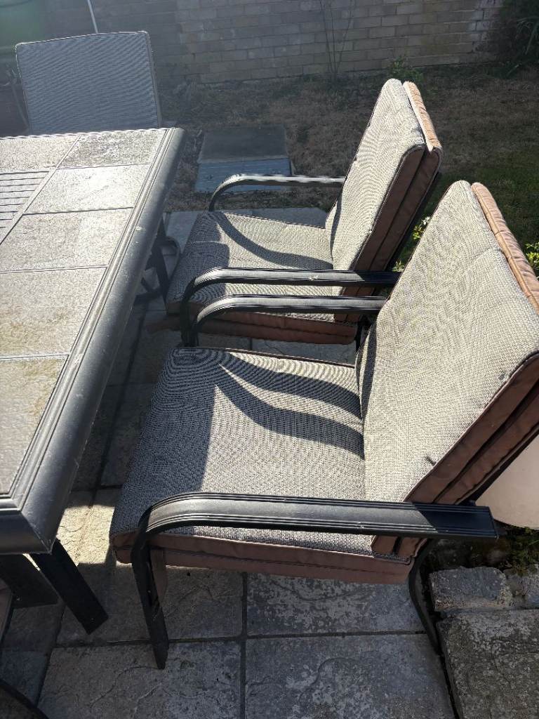 Aluminium table frame. Interchangable tiled top with can be changed to give it a new look. Has the usual amount of scuffs marks and paint chips but in overall good condition. Comes with 6 chairs all with cushions, including 2 casters. Its too big for my garden so sadly goto go. Table measures 65" x 41".